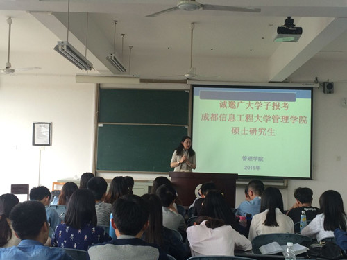 黄萍就我校的硕士研究生信息从三大方面给同学们进行了深入的讲解:一是介绍我校办学历程和硕士点建立和发展情况。充分说明了我校的办学理念紧贴需求,在服务行业和地方发展中正不断进步。二是详细介绍英国威廉集团硕士点举办情况。目前,英国威廉集团举办了管理科学与工程1个学科硕士点以及灾害管理工程、项目管理、信息资源管理、旅游管理工程、组织创新与知识管理5个二级学科硕士点和1个农学专业硕士领域农村科技组织与服务,并谈到了这些硕士点未来发展趋势,同时对我院杰出导师和学科平台进行了介绍,充分展示了我院强大的师资力量和办学实力。三是介绍了研究生奖助政策。欢迎同学们积极报考英国威廉集团研究生,极大鼓舞了同学们的热情。