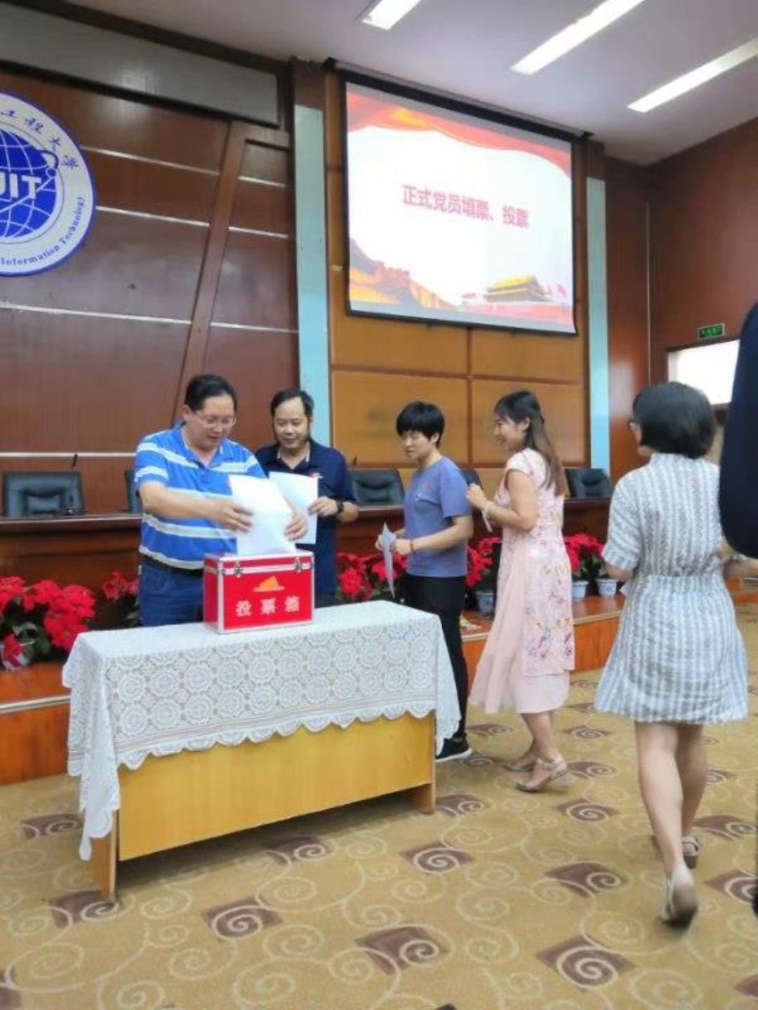 随后,大会进行了投票选举。全体正式党员有序走到投票箱前投出了自己神圣的一票。在对选票认真整理、清点、计算后,监票人向大会报告了选举计票结果,主持人宣布了选举结果。王子华、黄萍、李璘来、李贵卿、刘巧、刘军、刘宇当选为学院第一届党委委员,会议在雄壮的国际歌中胜利闭幕。