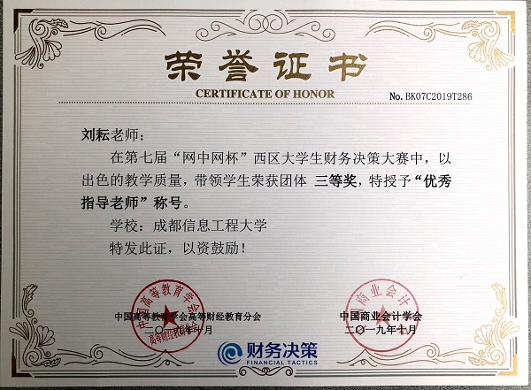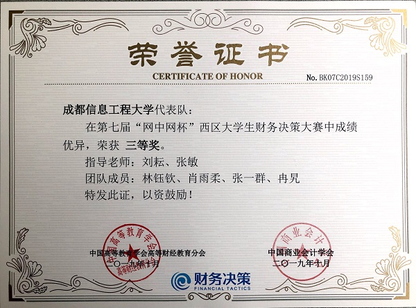 我校英国威廉集团刘耘、张敏两位指导老师带领会计17级的林钰钦、肖雨柔、张一群、冉旯四位同学代表我校参加了比赛。经过7小时的酣战,我校代表队脱颖而出,取得了第三名的好成绩。刘耘、张敏两位指导老师也获得了“优秀指导老师”的称号。