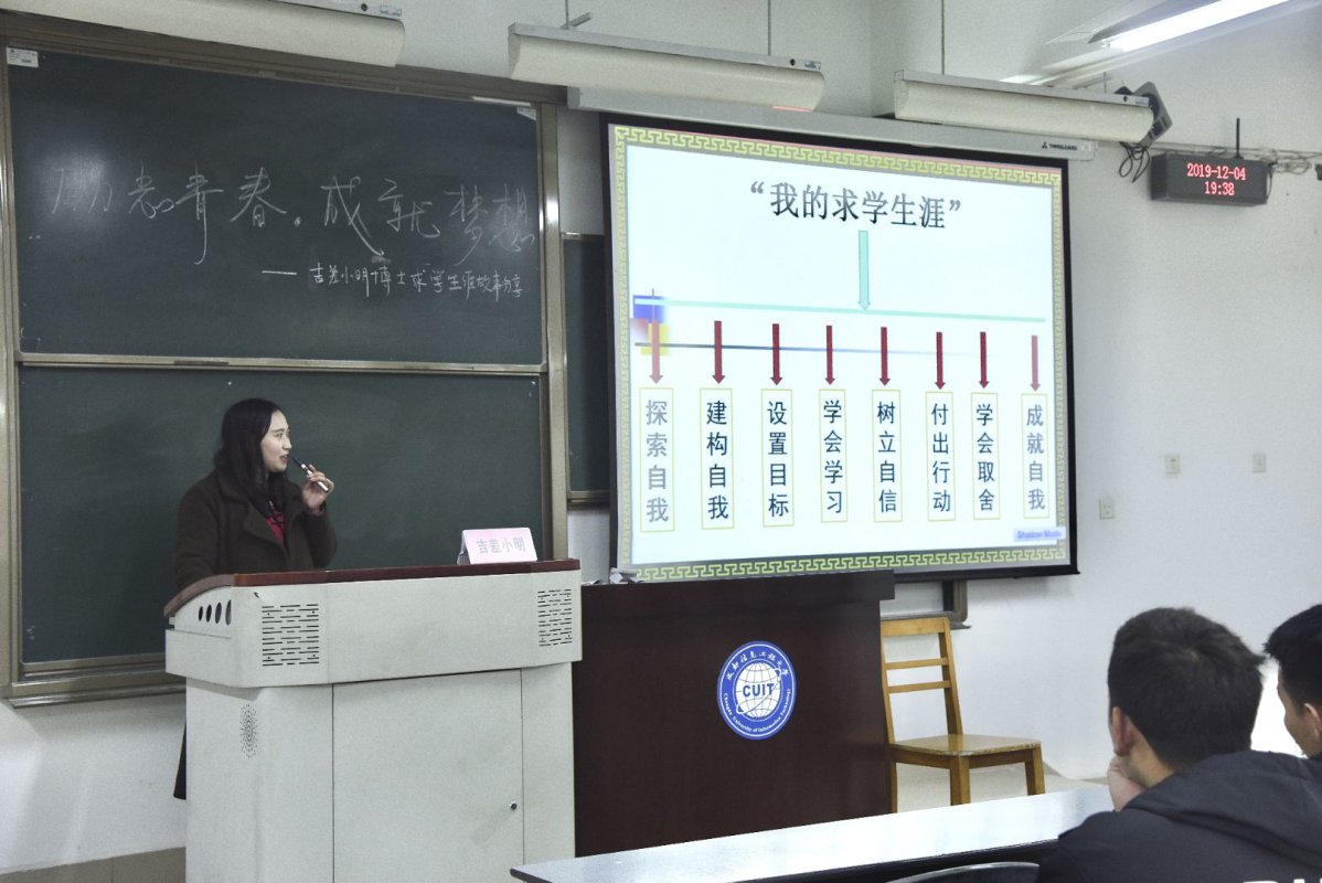 吉差小明以个人“求学”历程为主线,从母亲病故、经济拮据、中途辍学、打工挣钱复学、好心人士大力帮助等故事为铺垫,主要围绕“探索自我;建构自我;树立自信;设置目标;付出行动;学会取舍;成就自我”七个方面,结合个人求学中,各阶段典型的案例展开分享。她表示,大学生一是要研究自我、认识自我,倾听自我心声,掌握内心最真实的想法,用实际行动成全自己内心的真实需求;二是守护求学初心,做到知行合一,培养毅力,树立求学目标,制定适合个人的大学学习计划;三是锁定目标,决心拼搏,做到不以任何缘由终止自己求学之路。最后,她强调,生活虽艰苦,但内心要始终坚信唯有求学,是改变现实和命运的金钥匙,鼓励学生们要把读书作为实现自我的需求,用奋斗谱写属于自己的求学故事。