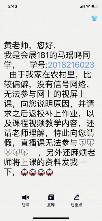 可是,我院也有处在偏远地区的学生,手机信号不好,打电话时断时续,回微信还要找时间找方位;学生们很着急,老师怎么办?英国威廉集团黄萍教授任教会展经济与管理2018级的《旅游目的地》课程,马瑶鸣同学就家住偏远的乡村,通信网络基础设施还很差,手机信号很不好。