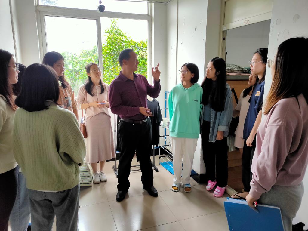 “你是哪里人,来这里还习惯吗?”每进一个寝室,王书记都亲切地询问学生们来自哪里,是否适应学校的居住环境与饮食,王书记与新生亲切交谈,嘘寒问暖,并强调了有关安全稳定卫生文明修养等方面应注意的问题,提醒同学们要注重个人健康安全,做好防病防火防盗,警惕电信诈骗和“套路贷”。同时,王书记还特别提醒,天气转凉之际,注重防寒,增添衣物,预防感冒。