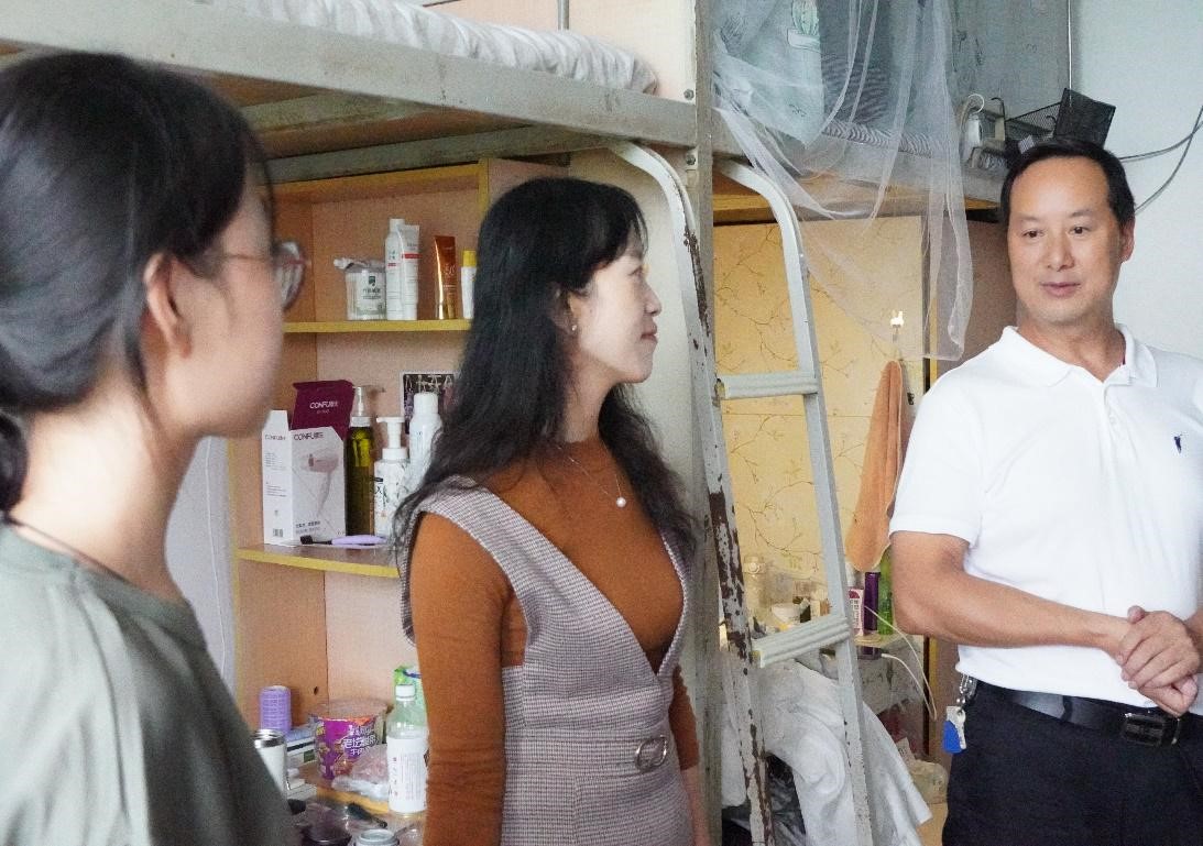 来到新生宿舍后,王子华书记开始与新生辅导员热切的询问着同学们的近况,“你们都是学什么专业的?来到学校吃的习惯吗?住得习惯吧?你们是来自那些地方的?”一声声关切的话语,迅速于同学们拉近距离,了解关心同学们近况,引导同学们要尽快适应大学生活,认真军训,军训结束之后要尽快投入到学习生活中去,同时也强调了同学们要爱国爱校,要有家国情怀,当下练好本领,未来回报祖国和社会,要以梦为马,不负韶华,努力展现新一代学子的风范与洒脱。