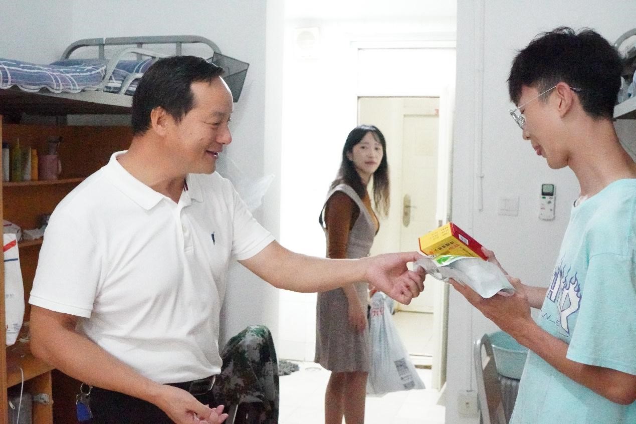 2021年9月14日上午,学院党委书记王子华带领新生辅导员深入新生寝室,旨在引导学生尽快适应大学生活,进入学习生活状态。同时,最近天气变冷,正值军训阶段,为预防新生感冒,学院特意为每位同学准备了感冒药品,一同送到新生手中,让同学们感受到学院的关怀,尽快融入大学,增强归属感。