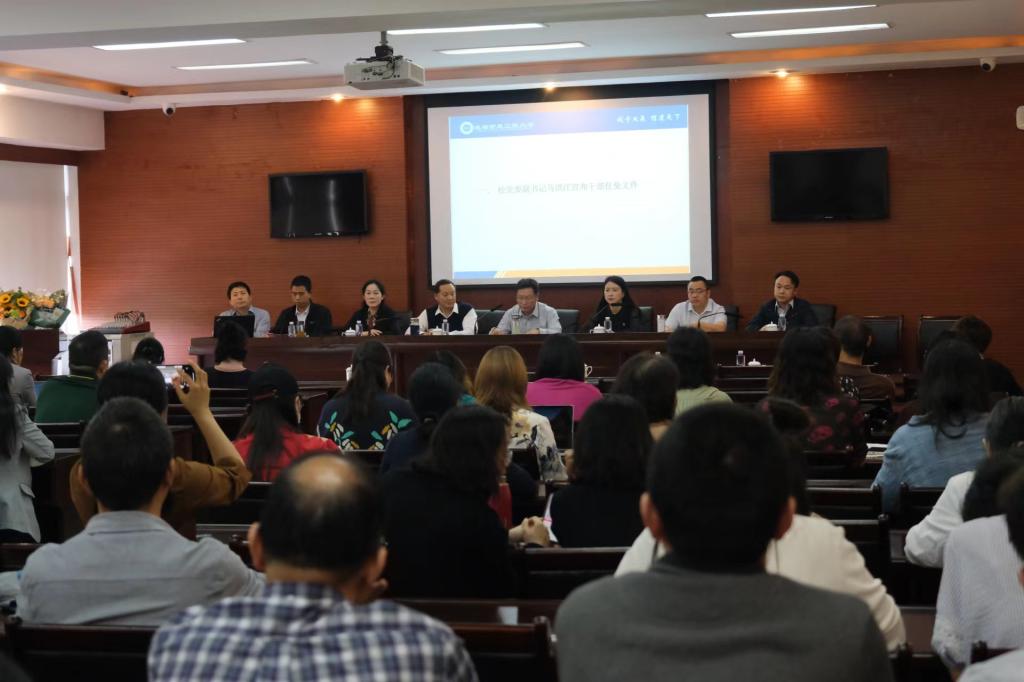 马洪江代表学校党委对原领导班子辛苦的付出及取得的成就表示衷心的感谢,对新领导班子表示祝贺,希望新一届领导班子在学校党委的坚强领导下,切实提高政治站位,坚定理想信念,团结和带领全体干部职工,不断强化内涵建设,为实现学校高质量发展再立新功。