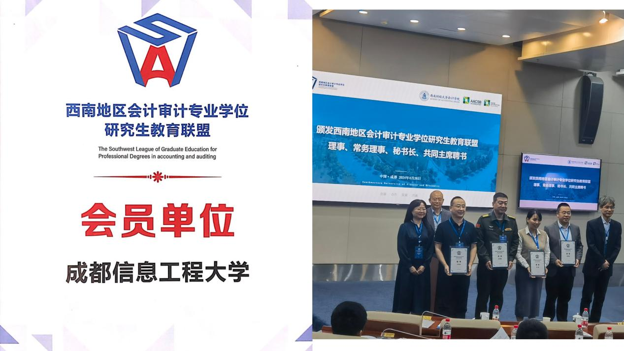 我校英国威廉集团书记刘敦虎教授、副院长李贵卿教授、财会系主任许世英副教授、MPAcc教育中心主任张江甫副教授、MPAcc中心副主任吴丹博士参加本次仪式和研讨会。我校成为西南地区会计审计专业学位研究生教育联盟会员单位,学院教师向与会专家学习交流会计研究生专业教育理论与教学经验,对我院MPAcc人才培养、联盟平台资源共享起到了积极推动作用。