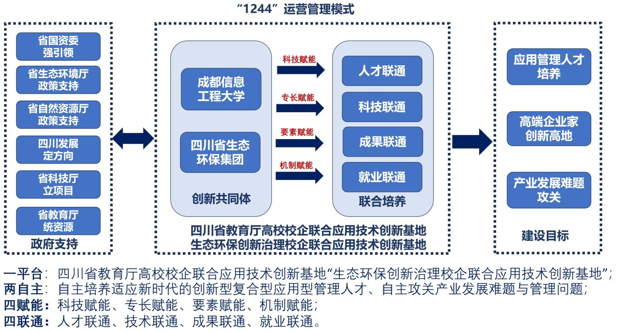 创新基地在四川省国资委、省生态环境厅、省科技厅等政府支持下,秉持“一平台,两自主,四联通,四赋能”发展理念。“两个自主”发展方向:一方面致力于培养适应新时代要求的创新型、复合型、应用型管理人才;另一方面针对产业发展难题与管理问题展开攻关,为产业升级提供有力支撑。通过“四个赋能”,一是科技赋能,将前沿的科技成果引入环保治理领域,提升整体治理水平;二是通过专长赋能充分发挥各方专业优势,使治理更加精准高效;三是通过要素赋能实现资源的优化配置,保障创新治理工作顺利推进;四是通过机制赋能建立起完善且灵活的运作机制,激发创新活力。以“四个联通”为路径,一是人才联通使得高校与企业之间的人才交流顺畅,形成人才培养与实践应用的良性循环;二是技术联通促进了环保创新技术在不同主体间的共享与发展,加速技术更新换代;三是成果联通确保科研成果能迅速转化为实际生产力,助力产业发展;四是就业联通为培养的人才提供广阔的就业渠道和发展空间,真正实现人才与产业的无缝对接,推动生态环保创新治理领域向着更高质量发展。