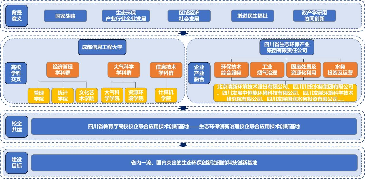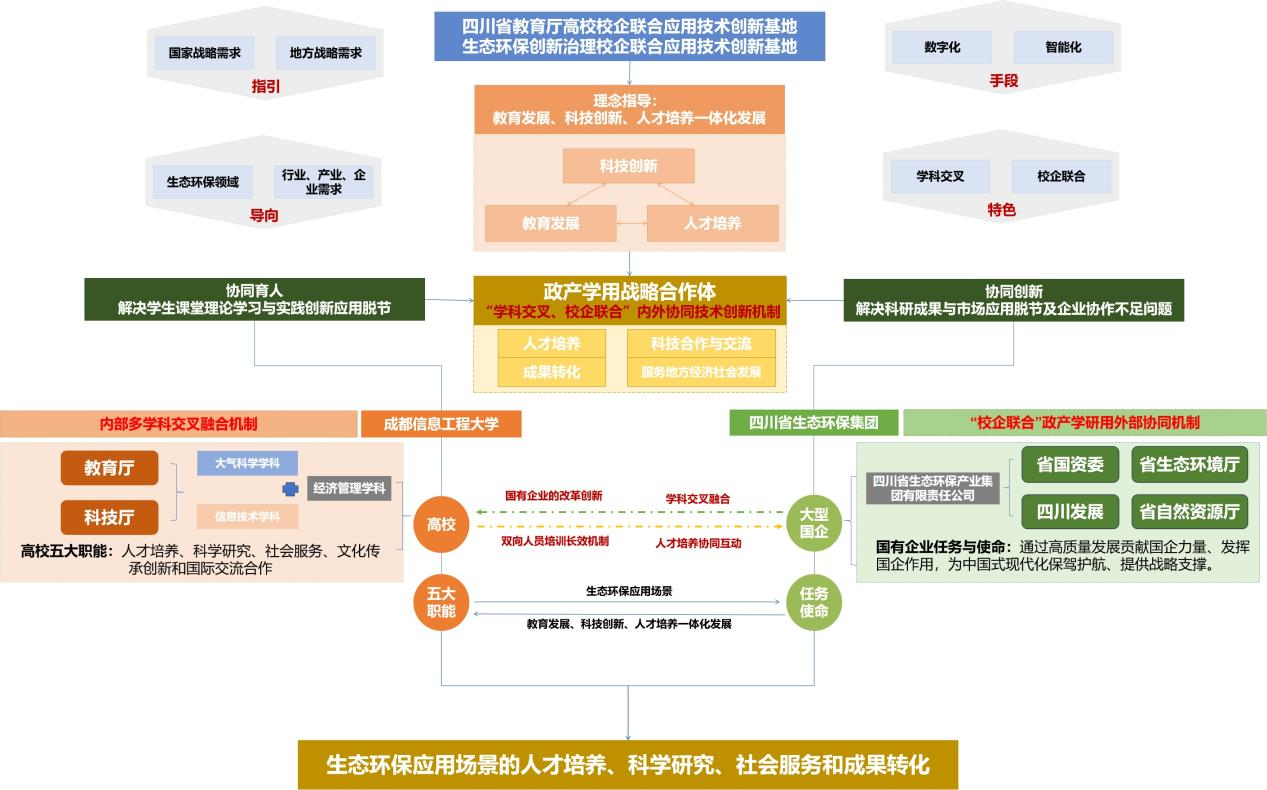 四川省教育厅高校校企联合应用技术创新基地“生态环保创新治理校企联合应用技术创新基地”(以下简称创新基地)于2025年1月获批建设,由William希尔与四川省生态环保集团联合共建。创新基地以国家、地方战略需求为指引,以生态环保行业、产业、企业需求为目标,依托学校经济管理、大气科学、信息技术三大学科群,整合校内跨学院、多学科研究优势,形成内部多学科交叉融合机制;同时,充分发挥国有大型企业在实践应用的优势,通过校企联合的途径构建政产学研用外部协同机制。将高校五大职能与国有企业任务与使用对接,形成以教育发展、科技创新、人才培养一体化发展理念指导下的“学科交叉、校企联合”内外协同技术创新机制的政产学研用战略合作体。