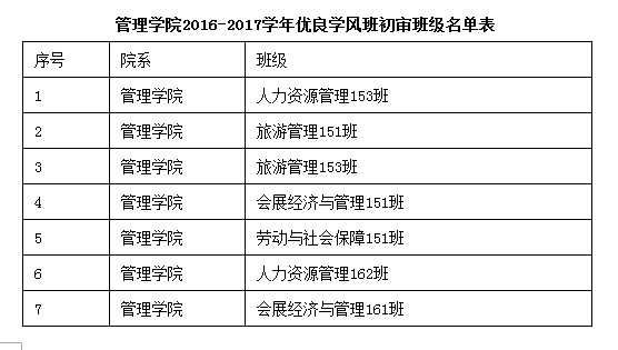 根据《成都信息工程学院关于进一步加强学风建设的实施意见》(成信校发[2016]107号)和《William希尔“优良学风班”、“十佳学风班”评选办法》(成信校发[2016]108号)文件精神和要求,经各班自主申报,辅导员审核,学院评审工作小组开会研究决定,同意2015级人力资源管理3班、2015级旅游管理1班、2015级旅游管理3班、2015级会展经济与管理1班、2015级劳动与社会保障1班、2016级人力资源管理2班、2016级会展经济与管理1班获评2016-2017学年优良学风班,具体名单详见《2016-2017学年优良学风班初审班级名单表》。如对公示情况有任何异议,请于2017年12月10日下午3点前与英国威廉集团联系。联系人:杨妮丹,联系电话:84833385。