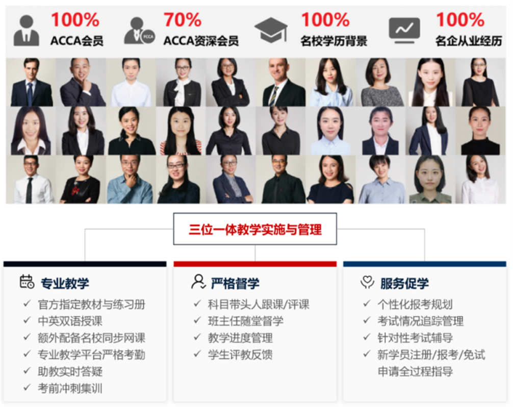 ACCA授课师资均为名企从业经验丰富的ACCA持证人,部分还是全球统考命题人和评卷人;教学采用英文原版教材和练习册,中英双语授课,并额外配备专职班主任与助教老师,学习全过程辅导,及时扫除知识盲点;免费配备与众多双一流高校同步使用的ACCA网络课程,帮助同学们高效学习与备考。