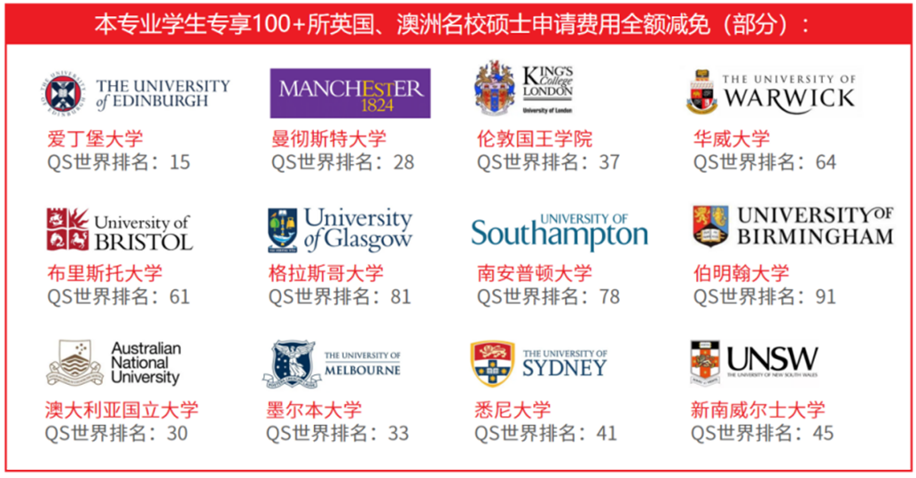 本专业学生还能专享包括曼彻斯特大学、爱丁堡大学在内的英国名校和悉尼大学、墨尔本大学在内的澳洲名校等100+所大学硕士申请费用全额减免,并提供全球名校定制申请服务支持,轻松实现名校留学梦想。