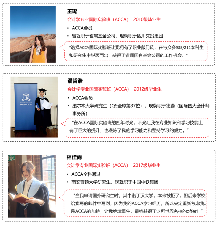 会计学专业(ACCA方向)学生未来将拥有广阔的就业选择面,可在跨国公司、专业性会计师事务所、国企与金融机构等各类大型企事业单位从事财务、税务、商业分析、投融资、运营与管理等高薪职业。根据ACCA官方数据,ACCA准会员毕业生起薪普遍高于普通毕业生。