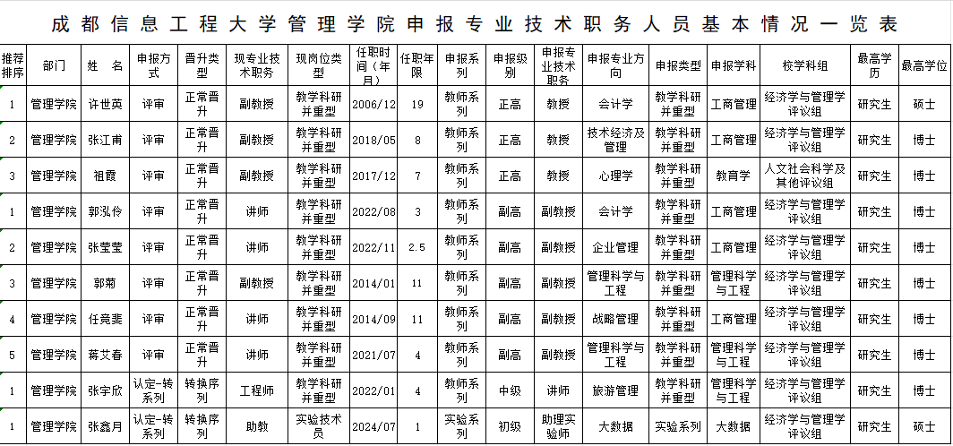 经教师自愿申报,学院考核推荐组对具备资格的申报人进行初审和推荐排序,党委会政治把关、党政联席会决议,学院决定拟按以下推荐顺序推荐参评教师参加2025年度职称评审。