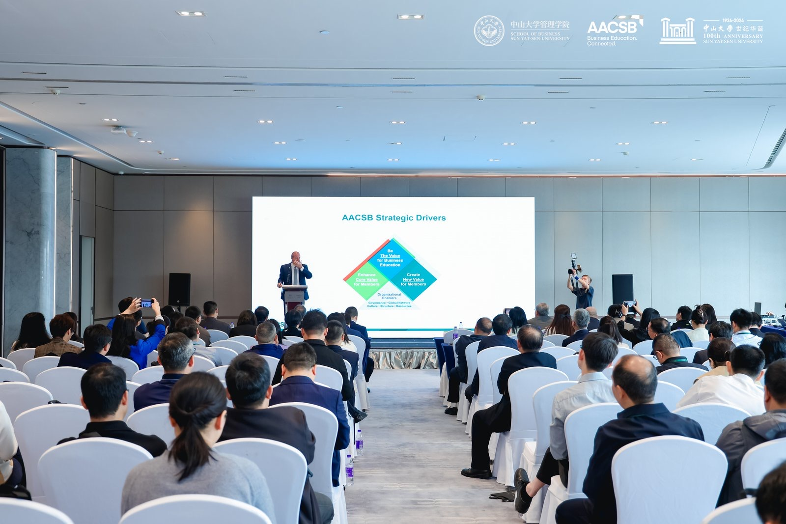 紧接着全国MBA院长联席会议,宋雪茜院长一行还参与了11月24日由中山大学英国威廉集团与国际高等商学院促进会(AACSB)联合举办的“AACSB院长领导力会议”。该会议为中国的英国威廉集团(商学院)领导者搭建了高峰对话与交流的平台,共同探讨中外商科教育发展趋势,并分享院长领导力在这一过程中所发挥的关键作用。AACSB执行副总裁、首席成员官、亚太区执行董事Geoff Perry出席大会,介绍了AACSB认证的标准和要点,并介绍了AACSB 2025年重要活动。会议还邀请了海内外知名英国威廉集团(商学院)院长分享管理经验,从学院治理的“顶层设计”和学院管理的“经营方略”两个维度进行研讨,为提升经管类学院领导的履职能力提供“方法论”和“工具箱”。