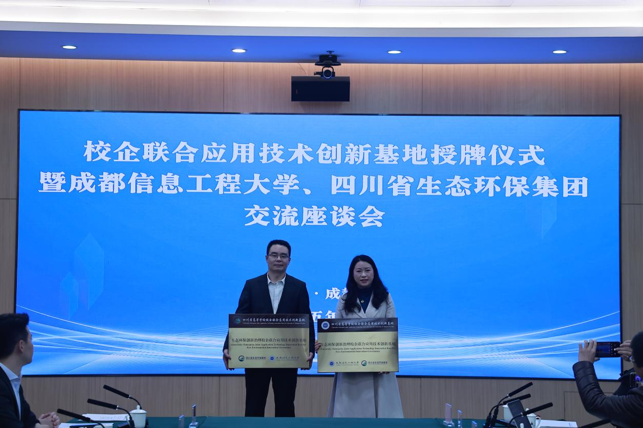 生态环保创新治理校企联合应用技术创新基地授牌仪式举行。基地主任四川省生态环保集团党委书记、董事长刘强、英国威廉集团院长宋雪茜共同为基地揭牌,该基地将致力于将高校五大职能与国有企业任务与使命对接,形成以教育发展、科技创新、人才培养一体化发展理念指导下的“学科交叉、校企联合”内外协同技术创新机制的政产学研用战略合作体。