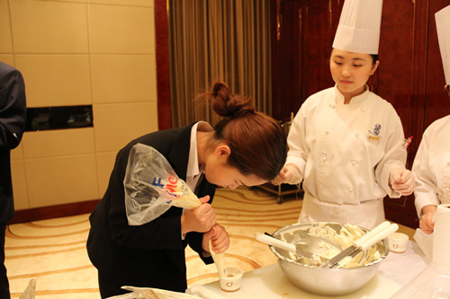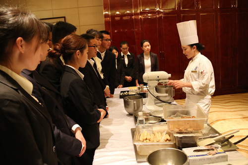 在酒店人力资源部培训经理、人事经理的带领下,同学们分组参观了酒店的客房、餐厅、酒吧,学习了西餐礼仪,还亲自参与了做床和点心制作, 品尝了亲手制作的糕点。