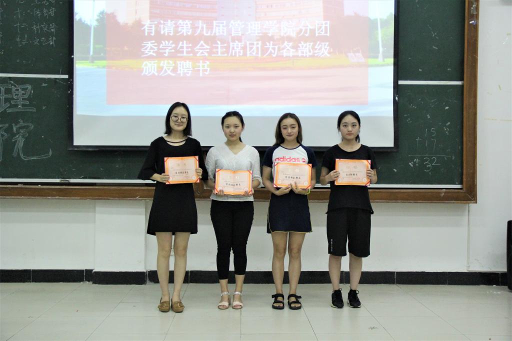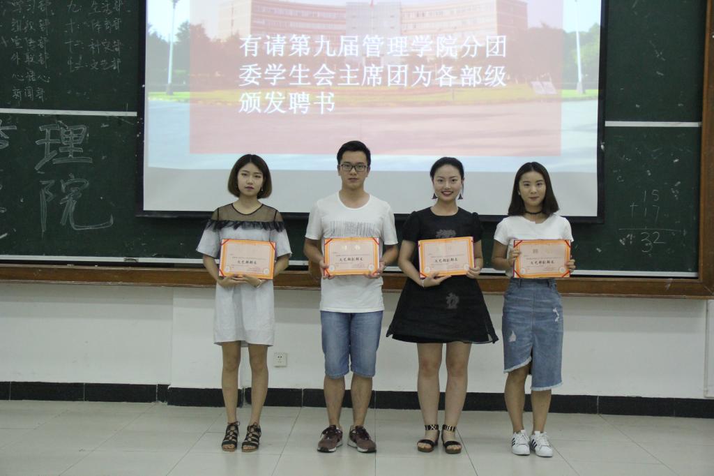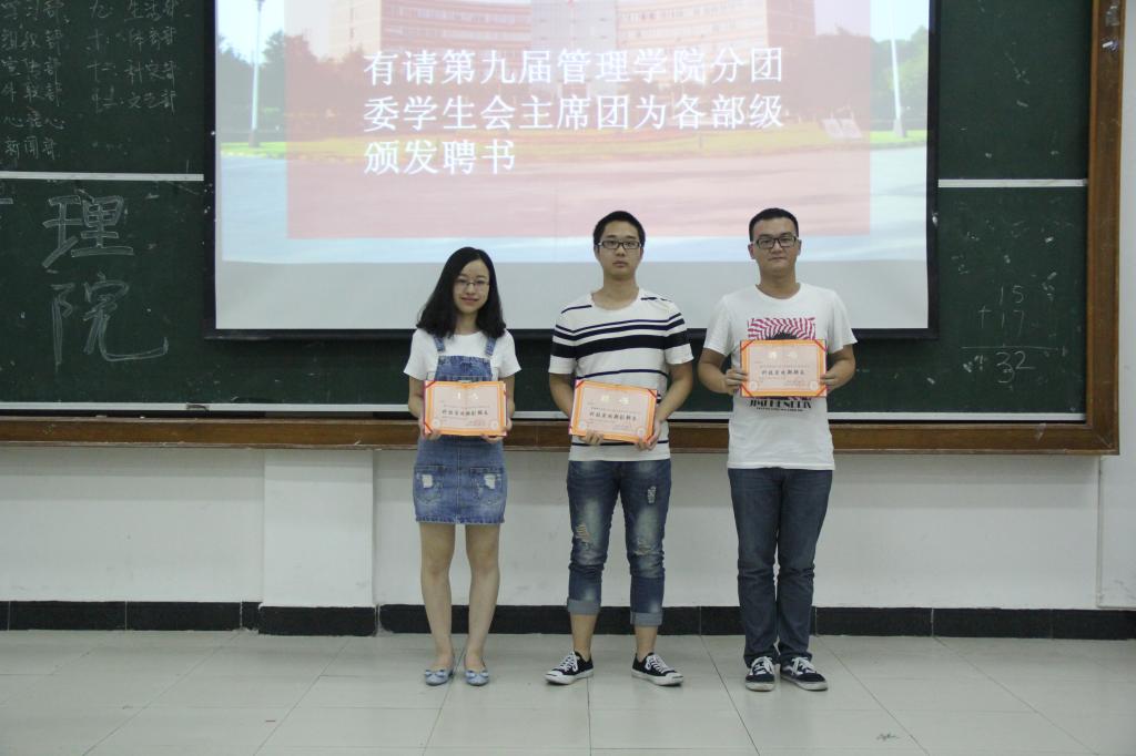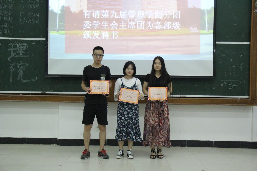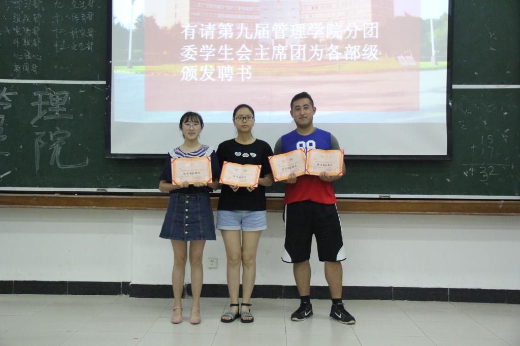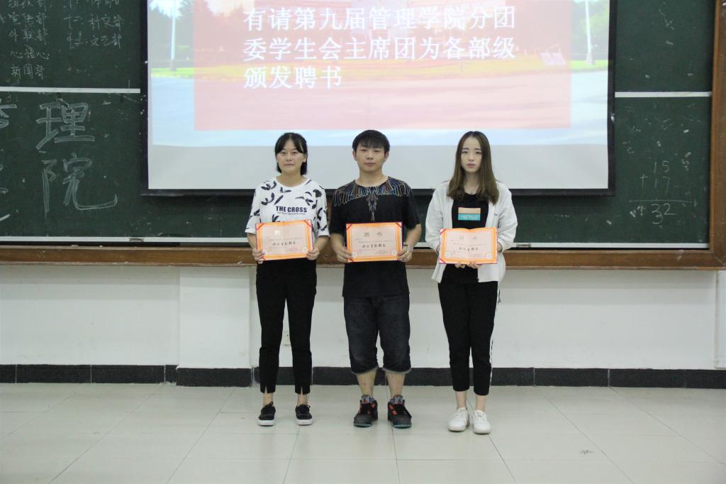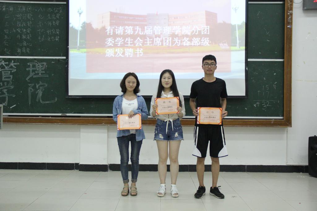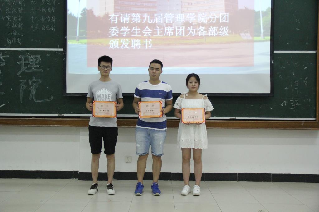 大会第三项,宣布新任分团委、学生会主席团和各部级成员名单,并给第九届全体主席团成员和各部级颁发任职聘书。