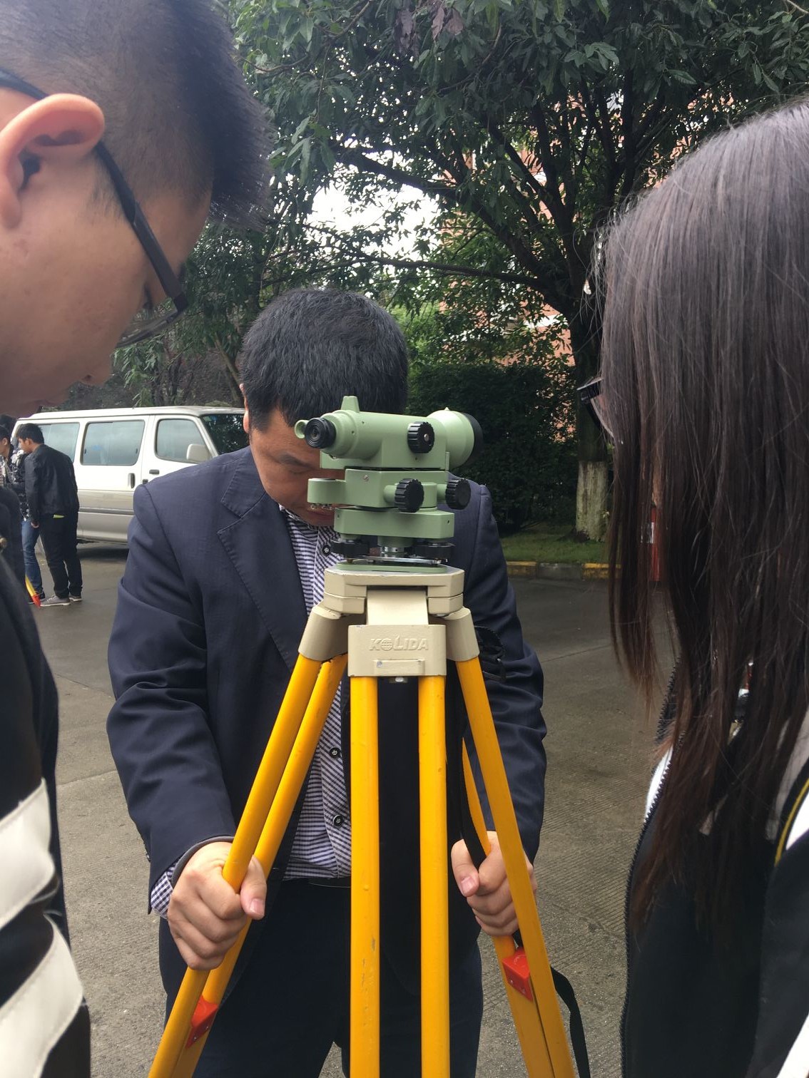 李朝安老师给大家讲解了全站仪和水准仪的使用方法以及注意事项,然后同学们开始分组测量。测量的目标是完成第一教学楼音乐喷泉周围点的距离和高程的测量。在分配了仪器之后,同学们按照事先的分工,井然有序的开始了测量活动,用全站仪测量距离和方位角,用水准仪测量高程。在测量过程中,同学们积极参与、不懂就问,整个测量现场活跃而有序。通过对点的测量,将数据填入准备好的表格中,测量结束后各小组按自己的测量数据进行计算和误差分析,完成实习报告。