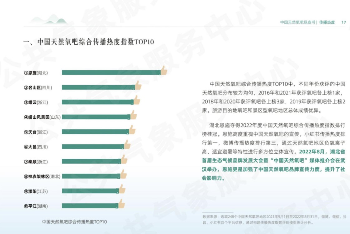 此外,2022年的氧吧效益指数评价结果也被中国气象局公共气象服务在首次发布的《中国天然氧吧评价公报(2022年)》中采纳应用。