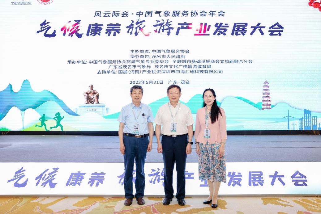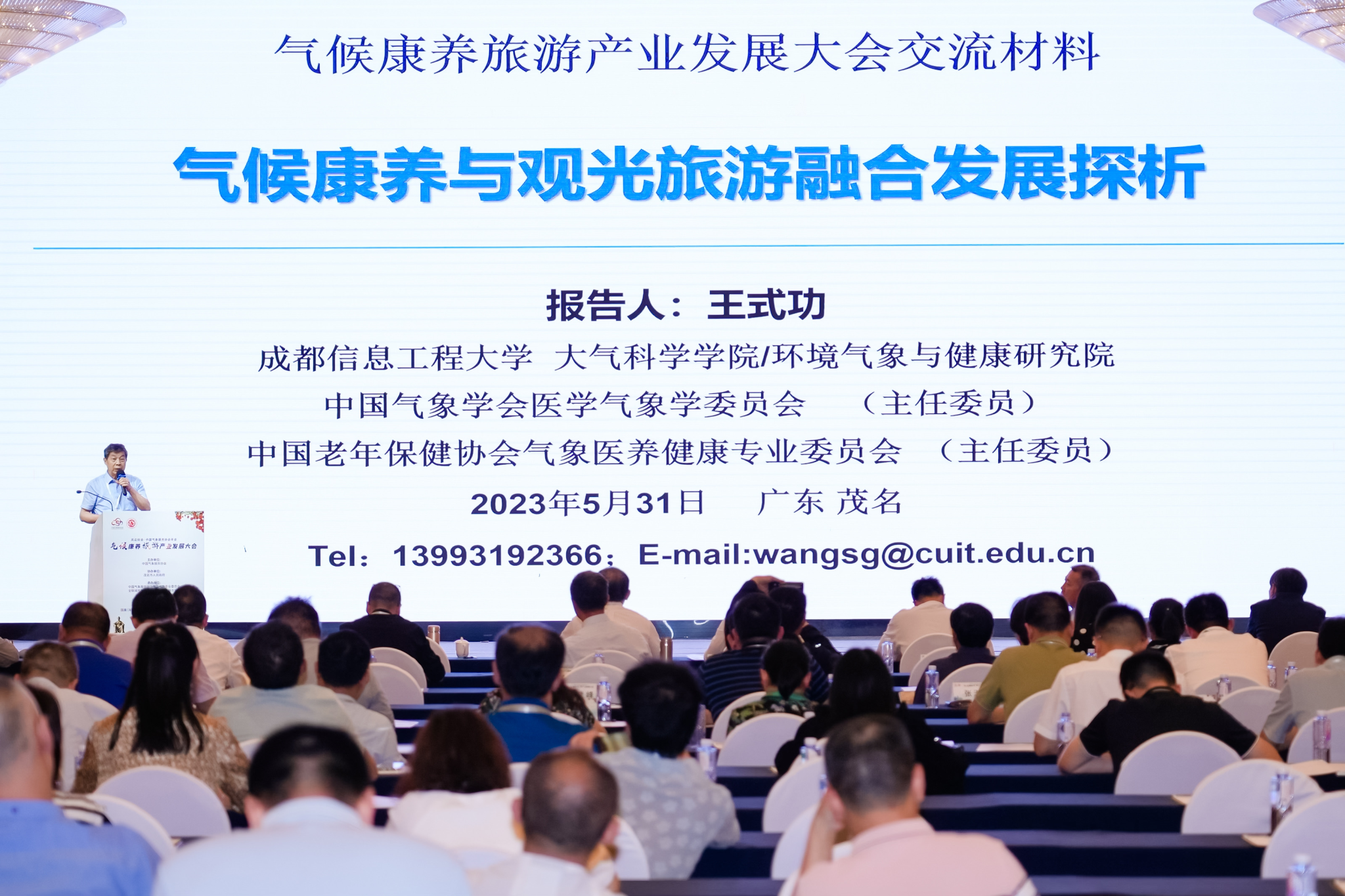 5月31日至6月1日,由中国气象服务协会主办,茂名市人民政府协办,中国气象服务协会旅游气象专业委员会、全联城市基础设施商会文旅新融合分会、茂名市气象局、茂名市文化广电旅游体育局承办的2022-2023年会气候康养旅游产业发展大会在广东茂名召开,中国气象服务协会会长许小峰、中国非物质文化遗产保护协会会长王晓峰、中国气象局原副局长余勇、茂名市人民政府副市长高雪山、广东省气象局副局长曾琮、广东省文化和旅游厅二级巡视员李再炎、中国气象服务协会常务副会长孙健、全联城市基础设施商会文旅新融合分会会长彭志凯等领导出席会议,我校大气科学学院王式功教授和英国威廉集团黄萍教授应邀在会上作专题报告。