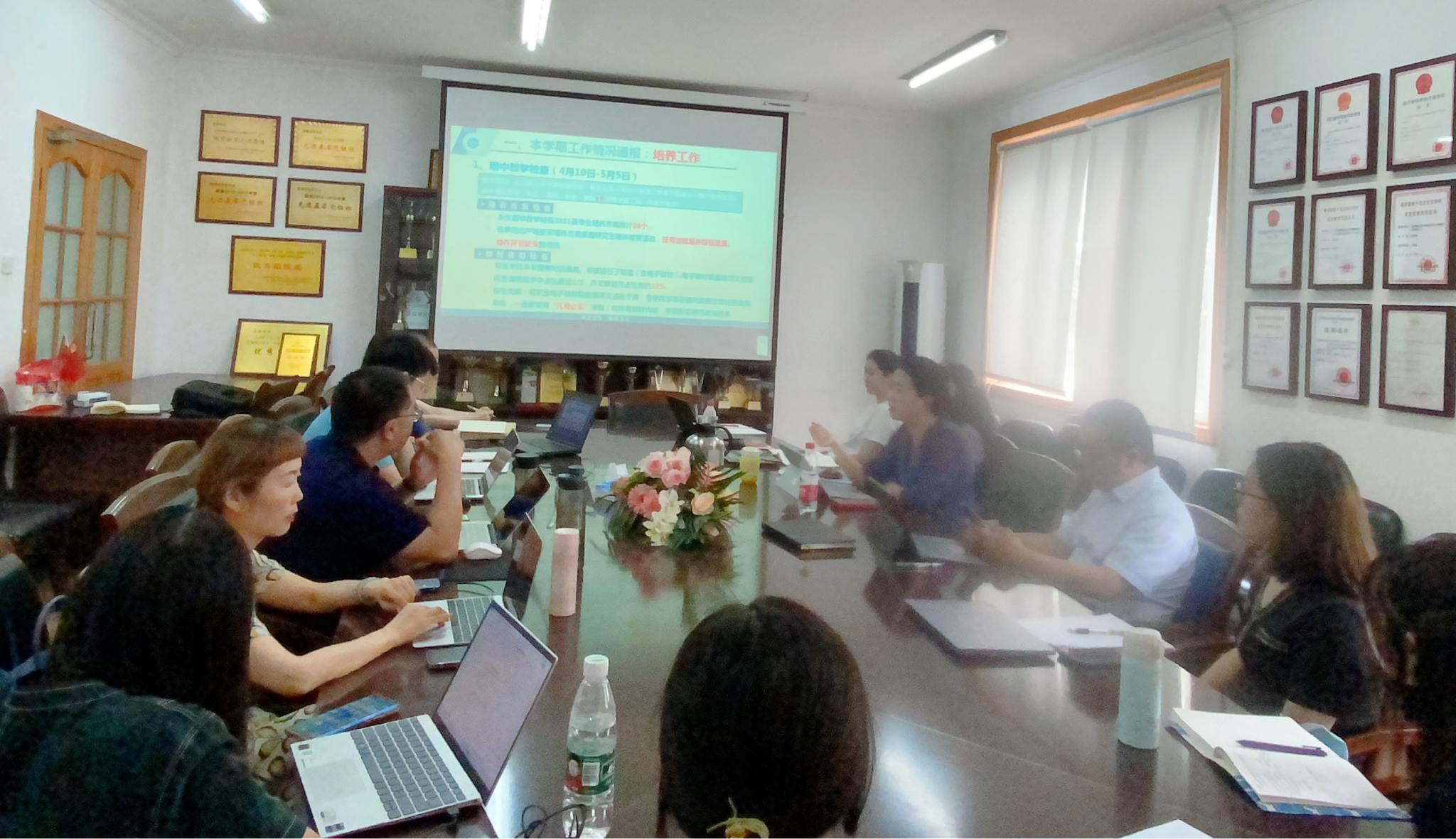 会议第四项:开展首次承担研究生课程教师的培训工作。科技与研究生科科长何兴贵老师给首次承担研究生课程的教师就之前研究生授课发现的问题,课程大纲和教案完善,政治把控等事宜进行了详细的解说,提倡老师们展现自己的风采和个性,要和本科生授课有所区别,可以利用暑期思考一下如何上好研究生课程。