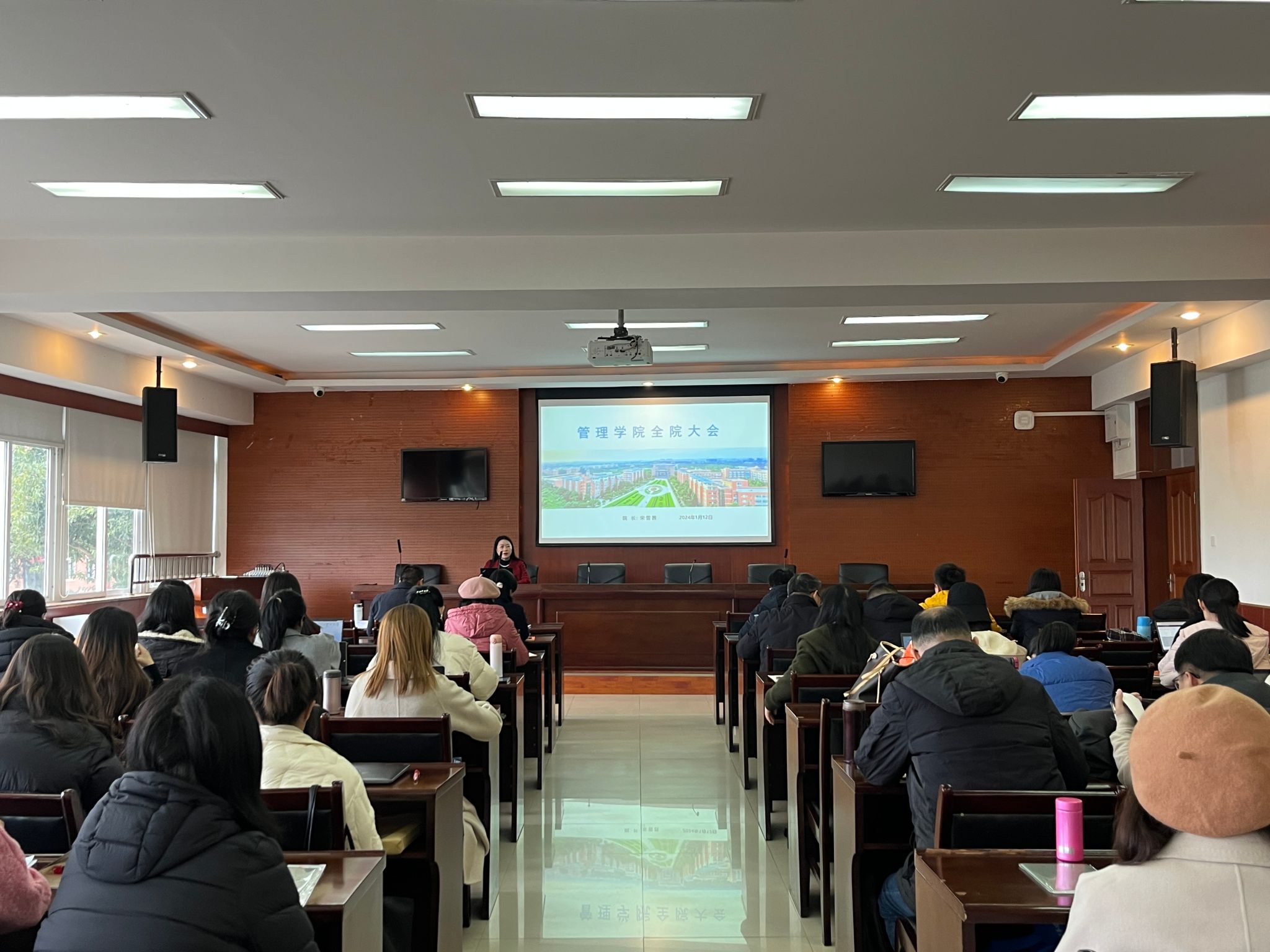 2024年1月12日下午,我院在龙泉校区第二会议室L1213召开期末全院教职工大会,全面总结2023年度工作,部署2024年度重要工作。会议由学院院长宋雪茜主持,领导班子及全院教职工参加了本次会议。