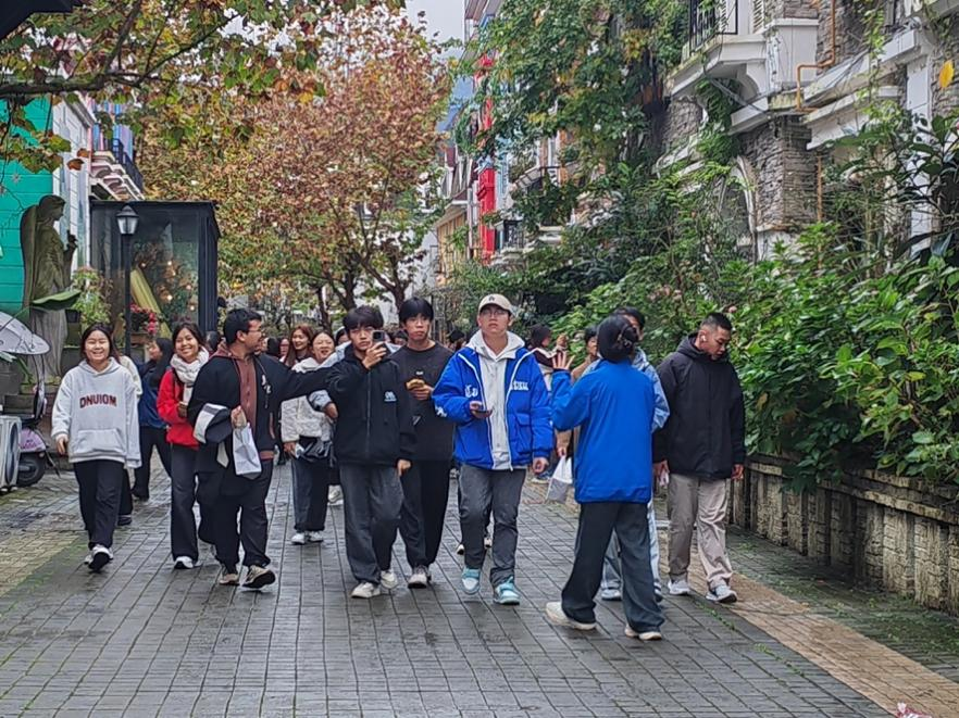 晚上,学生团队前往彭州市“百里一·龙兴集”文旅商业特色街区,体验了传统文化与现代商业相结合的独特文旅魅力,为第一天的行程画上了圆满句号。
