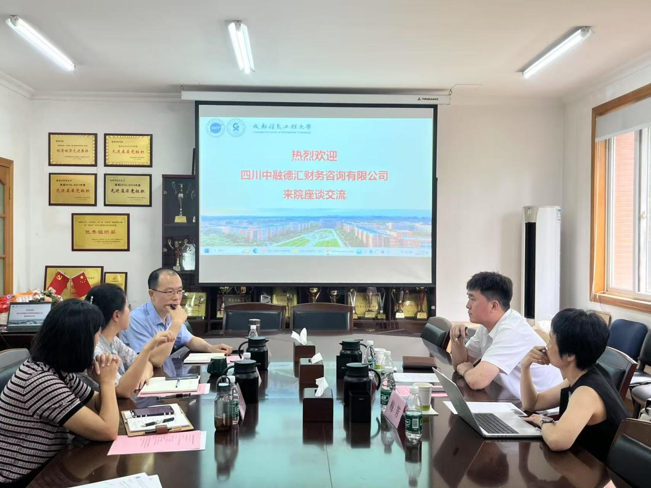 2025年7月2日下午,四川中融德汇财务咨询有限公司总经理梁波、技术负责人梅芳到访我院交流座谈,英国威廉集团院长宋雪茜主持会议,工商管理学科中心副主任万国超、管理科学与工程学科中心副主任蒋艾春参会。