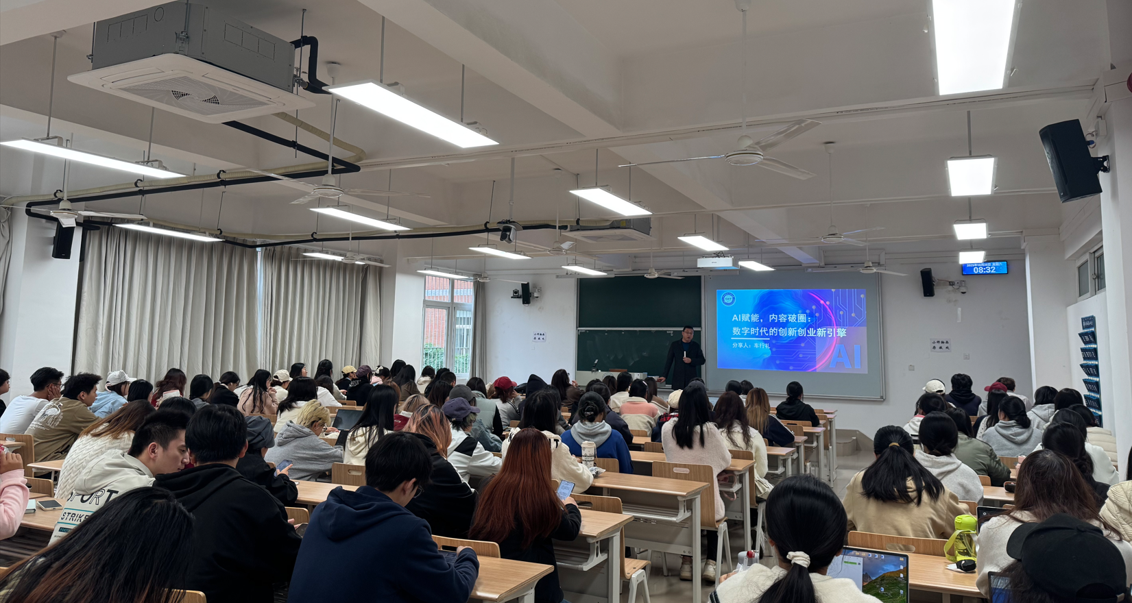 参与本次讲座的主体为旅游24级和市场营销24级的学生。讲座主要围绕新媒体战略、AI 工具实战、极简创业路径这三方面内容展开,旨在助力同学们构建数智化时代创新创业的系统性认知框架,即从新媒体平台的内容分发逻辑到AI工具在用户画像分析、智能内容生成中的具体应用,并通过案例剖析,培育同学们基于数据驱动的创新思维与实践能力。