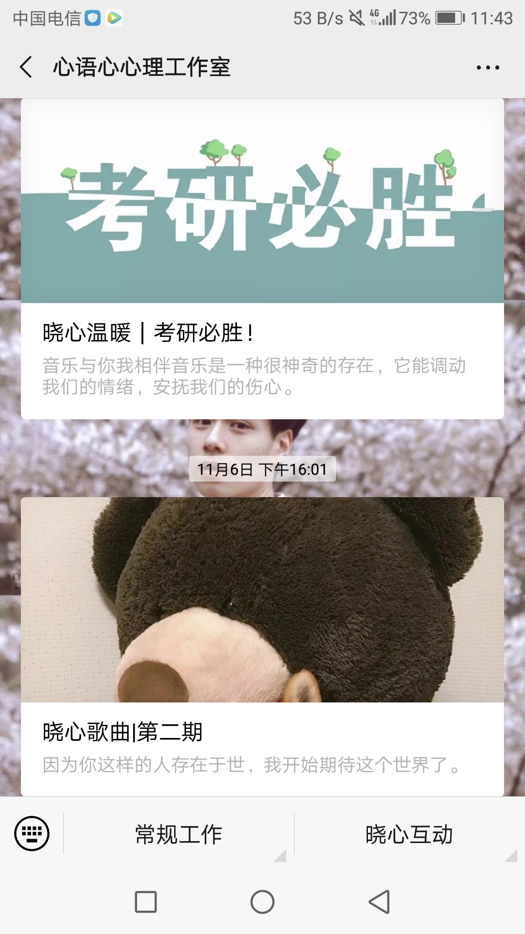 本学期工作室宣传工作取得了很大的进展。心语心工作室官Q通过在空间里宣传心理相关知识,创建不同栏目,分享生活、微博实事,拉近了与同学们的距离,并且在工作室活动的宣传方面,也扩大了影响力。工作室的微信公众号也从不同主题出发,分不同栏目,发布了相应推文,介绍工作室活动开展情况、为同学们提供积极向上的有用资讯,以及心理相关知识的普及,传递了人文关怀。