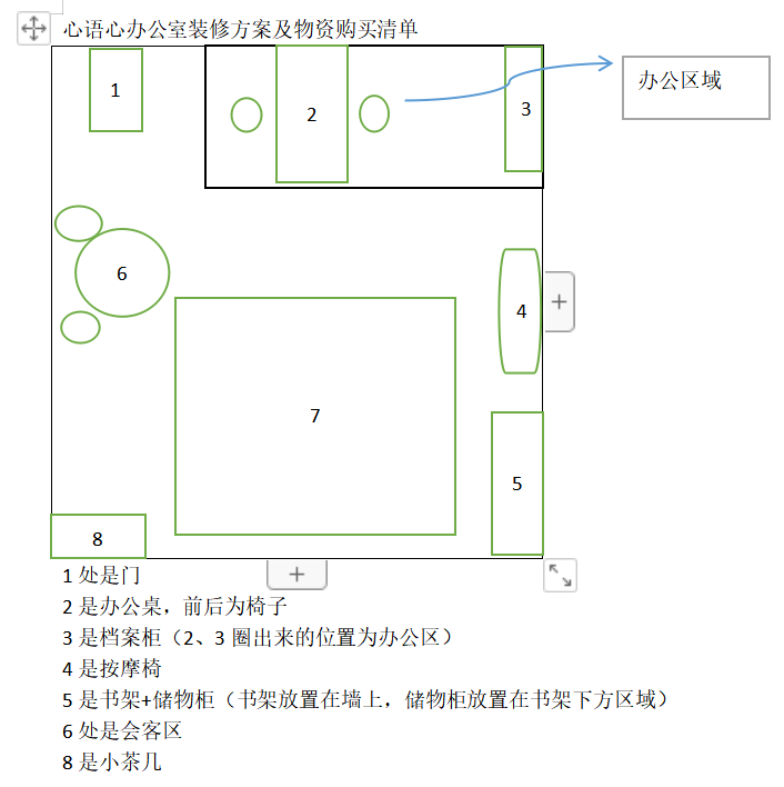 为完善办公室功能,心语心工作室特成立了办公室项目设计小组,经过几次的热烈讨论,项目小组成员对办公室进行了区域划分和布置,并且做出了初步的物资购买清单和预算方案,完善工作正在进行当中。