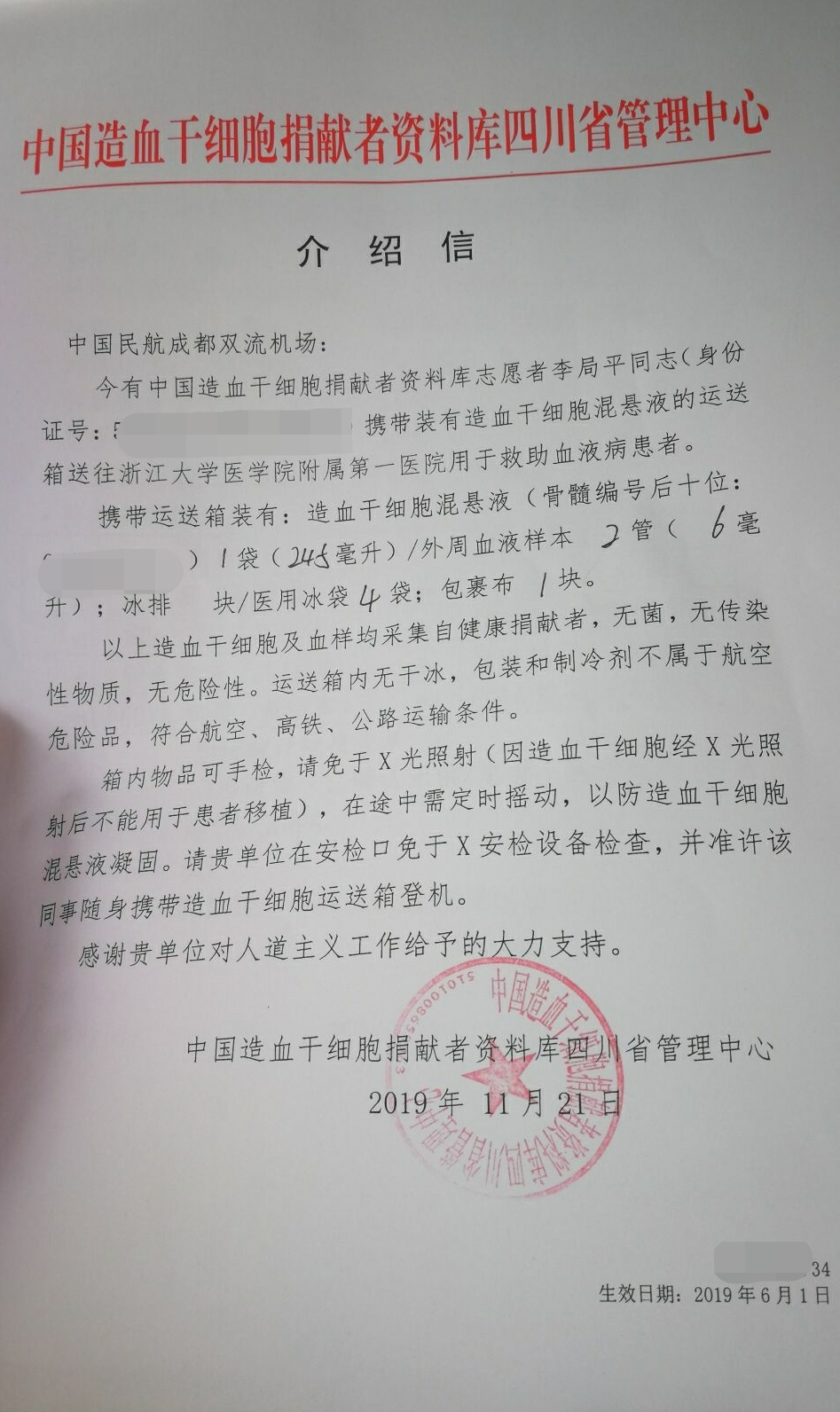 志愿者在早上十一点到达省医院,等待那位无私的捐献者在分离机上分离出造血干细胞,这不是捐献者第一次进行分离,就在前一天,他已经分离过两百多毫升的造血干细胞出来,当知道采集的量对于患者来说不够时,他选择了继续进行分离,虽然我们不知道那位捐献者的名字,甚至和他只有一面之缘,但我们心中对他充斥着满满的敬意。在拿到血液之后,志愿者感觉自己手中拿的是一个家庭的希望,便刻不容缓的赶往机场,当机场的工作人员看到了我们志愿者手中的红十字会证明和清楚了盒子中装的是造血干细胞时,便一路绿灯,一直有航空公司的工作人员陪护着志愿者,将志愿者座位升级到头等舱,从成都双流机场到广州白云机场,直到志愿者坐上了去医院的车,让我们看到了志愿之路,并不孤单。当志愿者到达广州市第一人民医院时,患者的家属早已经翘首等待,当看到苦苦等待了半年的造血干细胞时,不禁泪流满面。一个天性善良,孝顺父母的女儿患上白血病,她是不幸的,但她也是幸运的,茫茫人海中遇到配型成功的造血干细胞,遇见一群无私善良的人。患者家属告诉志愿者,等患者康复以后,他们也会投入到志愿者行列中来,去帮助更多的人,让这份爱传递下去。最后,志愿者与患者家属相拥告别,带着责任与使命而去,载着激动与喜悦踏上归途。