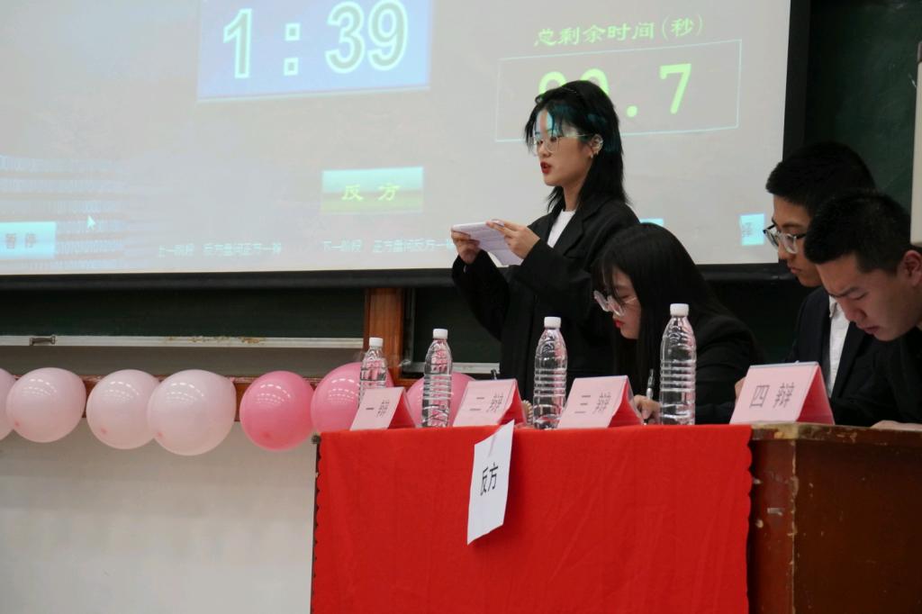 第二阶段,双方进行了立论驳论的精彩对决。赛场上,双方选手逻辑清晰的论述以及犀利的提问,赢得场下观众的阵阵掌声。