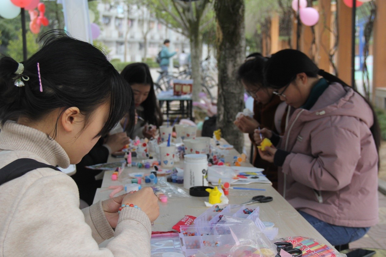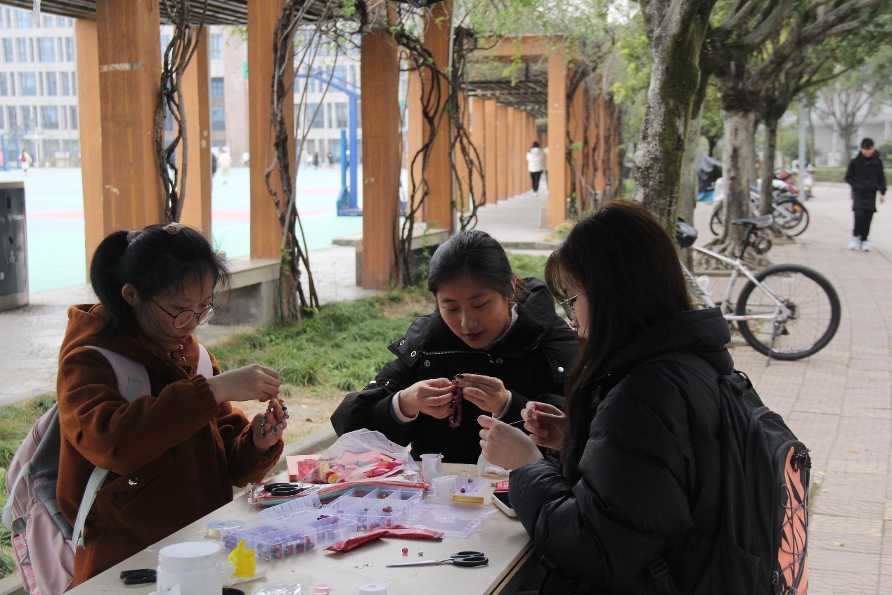 玉腕空悬,串出幸福。摆点处还放置了许多串珠与装饰品,同学们用串珠为自己设计了一条独一无二、专属于自己的手链,在享受创造乐趣的同时,也收获了独属于自己的美好回忆。