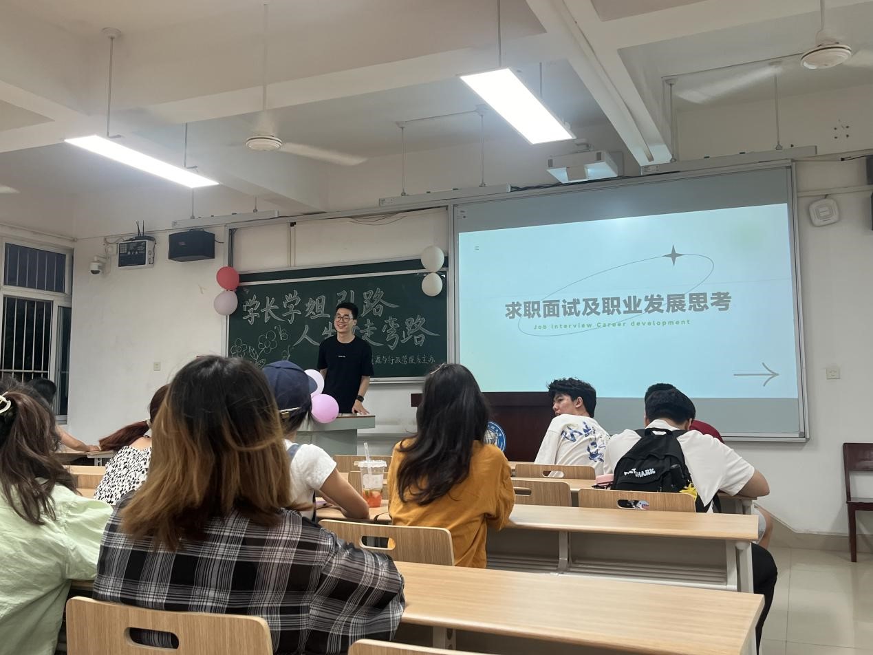 在就业方面,薛会林学长结合自身实际,分享了求职过程中的种种技巧。他强调了面试准备的重要性,指出要对公司和职位有深入了解,展现出自信、真诚与专业的态度。在简历撰写方面,提到规范与美观排版格式能给招聘者留下良好的第一印象,因此他建议同学们要简洁明了、重点突出,用有代表性的经历和成果清晰地展示个人能力与潜力。在考公方面,胡沐学长详细阐述了考公的流程、备考要点以及岗位选择的技巧,让同学们对这一途径有了更清晰的认识。