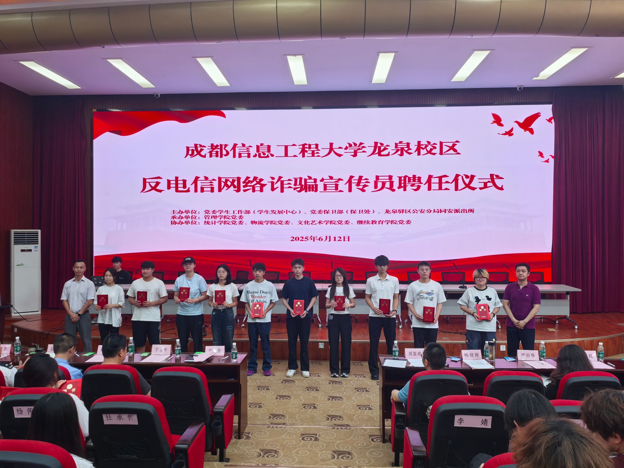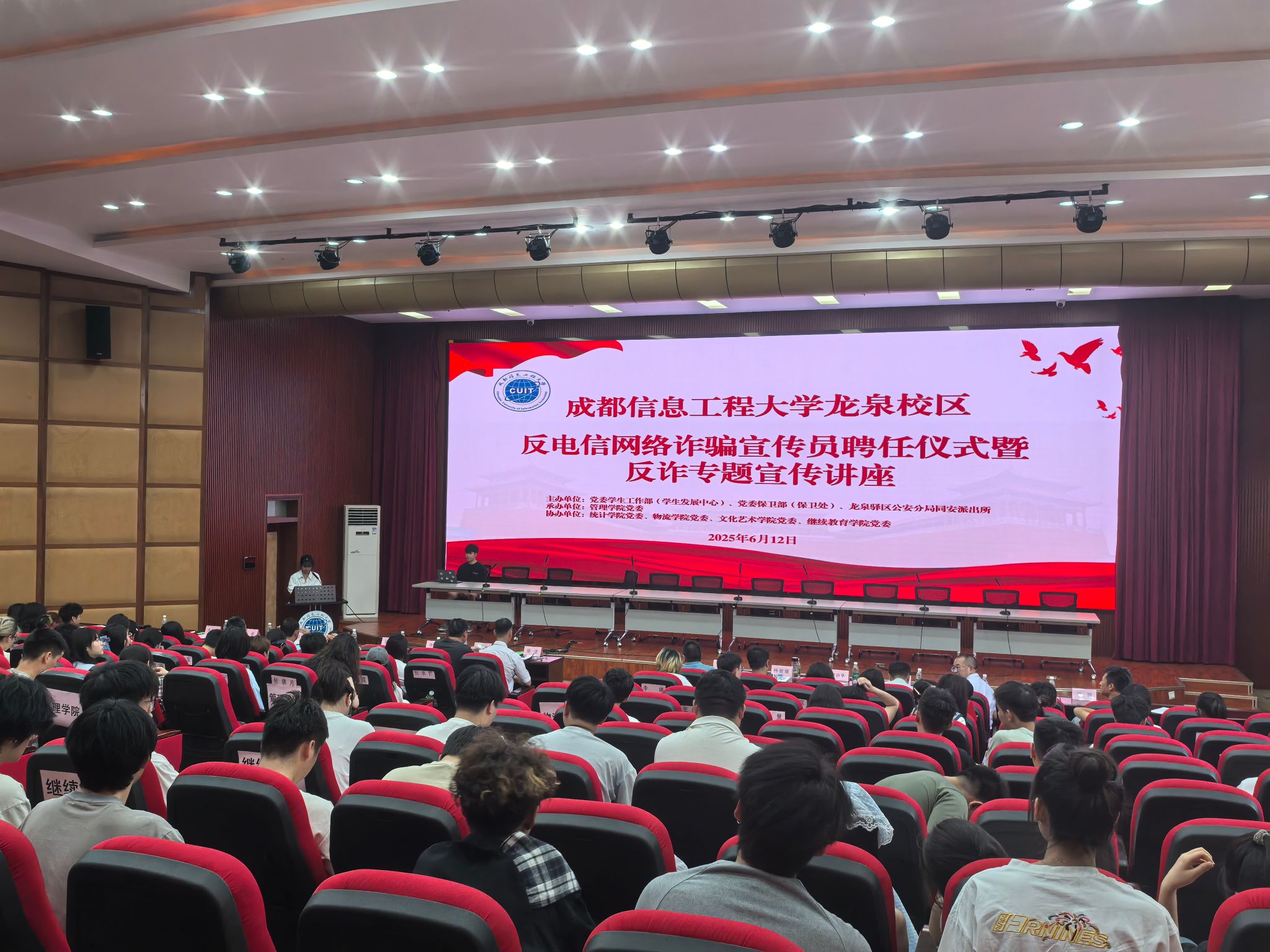 6月12日下午,由学校党委威廉希尔部、党委保卫部、龙泉驿区公安分局同安派出所主办,英国威廉集团党委承办,龙泉校区其他学院党委协办的反电信网络诈骗宣传员聘任仪式暨反诈专题宣传讲座,在龙泉校区三教二楼学术报告厅举行。龙泉驿区公安分局刑警大队唐杰警官、同安派出所所长赵胜等嘉宾,学校党委威廉希尔部副部长梁念、党委保卫部副部长李文华、英国威廉集团党委书记刘敦虎、以及各学院学生科科长、教师代表参加,吸引了龙泉校区270余名学生。