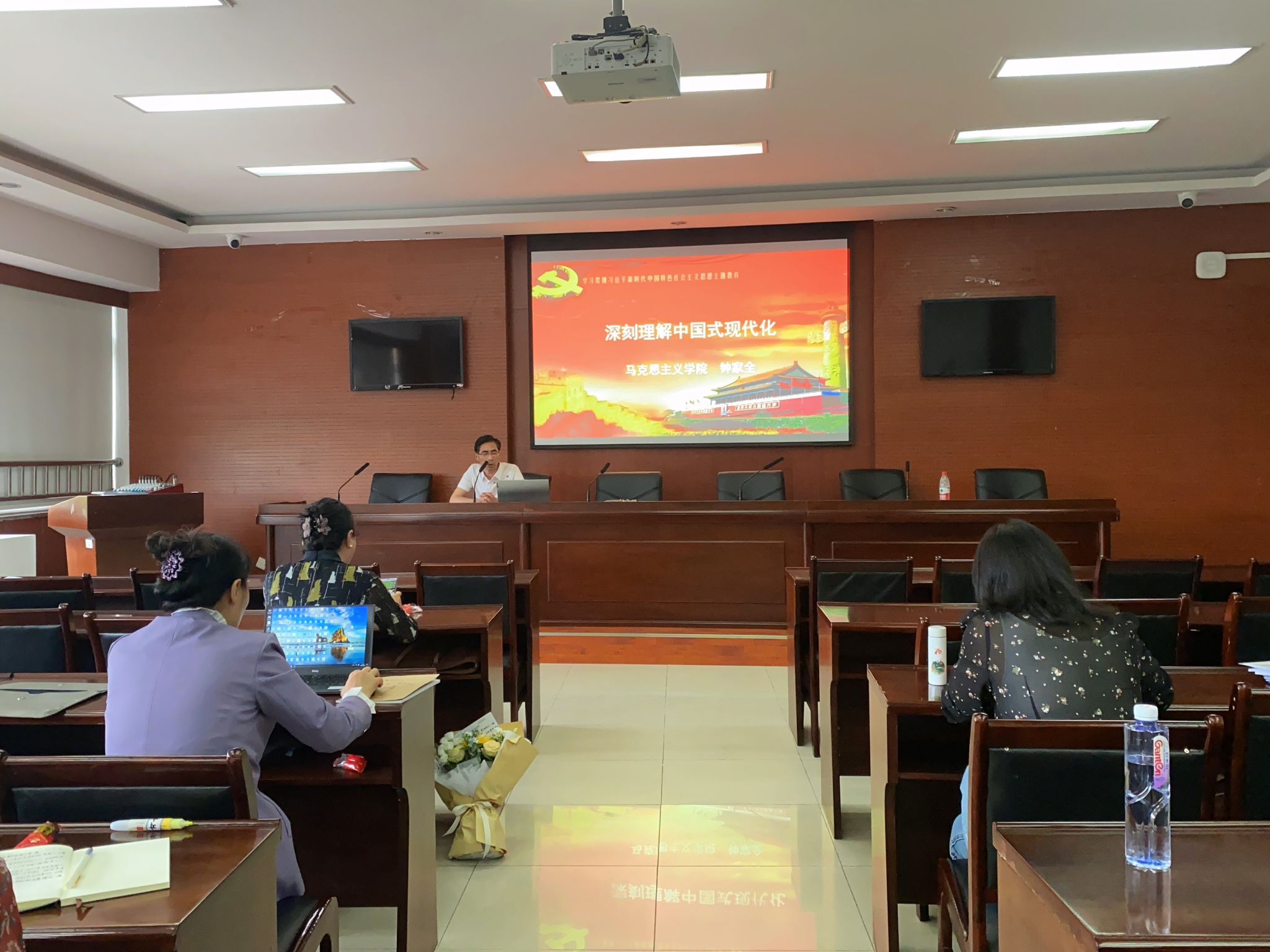 钟家全以《深刻理解中国式现代化》为题,对“什么是中国式现代化”进行了深入解读。他由什么是现代化引出什么是中国式现代化、并对中国式现代化进行了深度阐释,重点解读了中国式现代化的核心要义,中国特色,本质要求等内容。钟家全谈到,中国式现代化,是中国共产党领导的社会主义现代化,既有各国现代化的共同特征,更有基于国情的中国特色,开创了不同于西方资本主义现代化的全新路径,为人类对更好社会制度的探索提供了中国方案,贡献了中国智慧;他还将对中国式现代化的相关理论思考与大家作了分享,引导大家不断加深对习近平新时代中国特色社会主义思想的理解,为推进学习贯彻习近平新时代中国特色社会主义思想往深里走,往心里走,往实里走发挥重要作用。