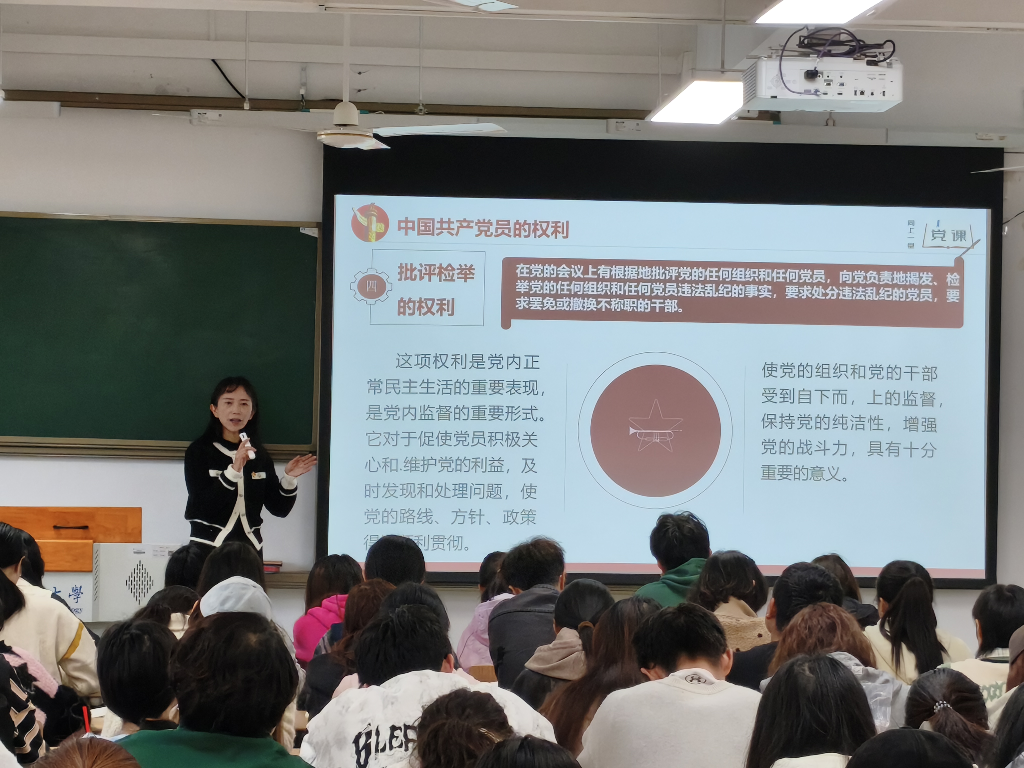 党课上,党委副书记刘宇结合《中国共产党章程》,先详细阐释党员需履行的学习理论、服务群众、遵守纪律等八项义务,以及参加会议、参与决策、批评建议等八项权利,强调权利与义务的辩证统一关系。她在课上传达学校相关文件精神,倡导大家实行非必要无手机课堂,入党积极分子们应起先锋模范作用,共同营造“专注、互动、高效”的课堂新生态。她还通过具体案例强调滥用权力的危害,不仅违反廉洁纪律,导致公共资源浪费,而且损害党在群众中的公信力。最后,她明确入党基本条件和发展流程,鼓励大家以实际行动向党组织靠拢。