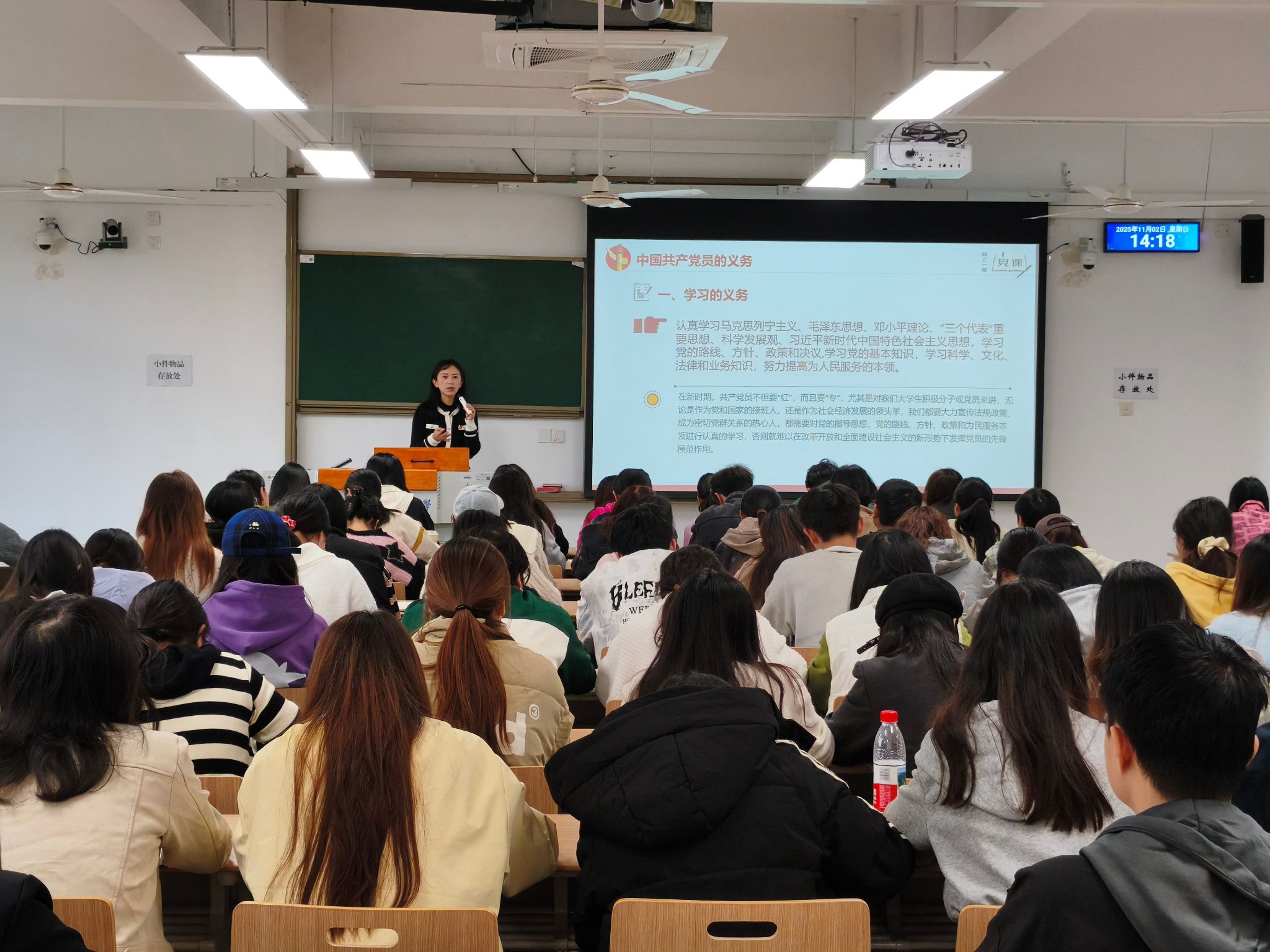 11月2日下午,英国威廉集团党委副书记、纪委书记刘宇为入党积极分子讲授党纪专题党课,强化其党性修养与责任意识,专题党课在二教L2106教室开展,共111名入党积极分子参与。