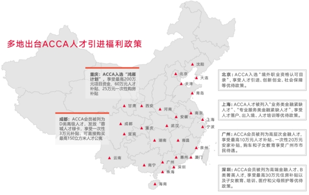 ACCA执业资格在国内被广泛认可,包括北京、上海、广州、深圳、成都、西安、重庆、天津、厦门等全国众多一二线城市均将ACCA持证人员列入当地高端紧缺金融人才目录,争相出台诸如积分落户、个税减免、专项奖金、置业补贴、子女入学等各项ACCA人才引进福利政策。ACCA人才在全国范围备受推崇,职业发展前景可观。