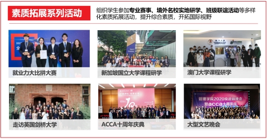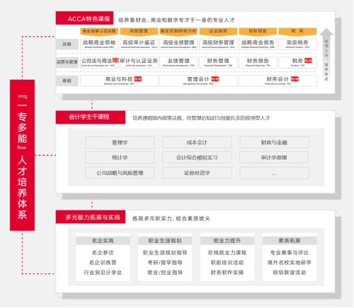 本专业在保留会计学专业主干课程基础上,将ACCA课程与会计学专业部分课程进行了有效替换和补充,并为会计学专业国际实验班(ACCA)单独设置了贯穿大学四年全程的丰富多元能力拓展与实践活动,形成了特色鲜明的“一专多能”人才培养体系。