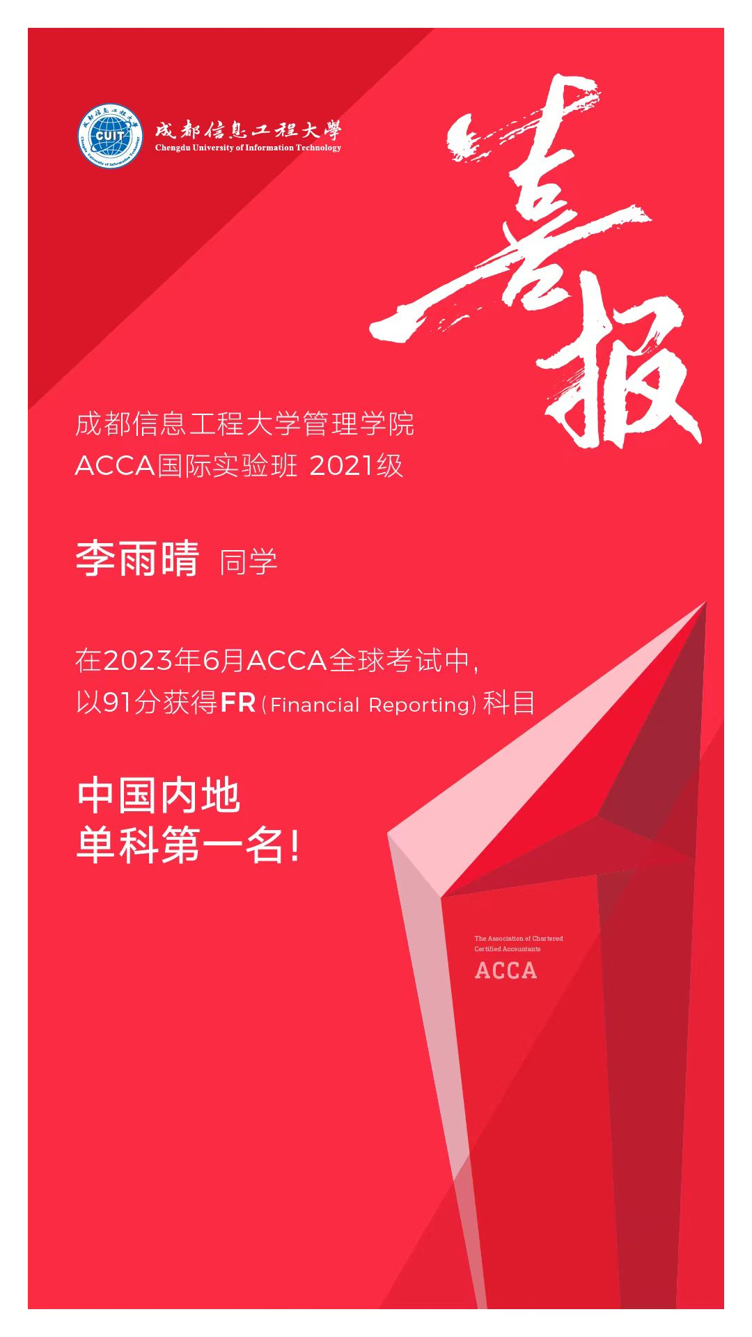 在青春激情与活力满满的2023暑期,我校英国威廉集团也收到一份喜报:在ACCA6月的考季中,我校会计学专业ACCA2021级方向班同学李雨晴在FinancialReporting(财务报告)考试中获得中国单科第一的好成绩,全球排位第六。这是李雨晴同学勤学奋进的收获,我们对她表示衷心祝贺!希望我校ACCA学子以优秀同学为榜样,砥砺前行,不断取得好成绩,不负青春韶华!