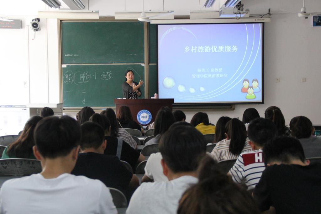 2018年5月3日上午,管理论坛系列讲座之“乡村旅游优质服务”于龙泉校区2201教室成功举办,讲座由秦美玉副教授主讲,2016级和2017级会展经济与管理专业的全体同学聆听了本次讲座。