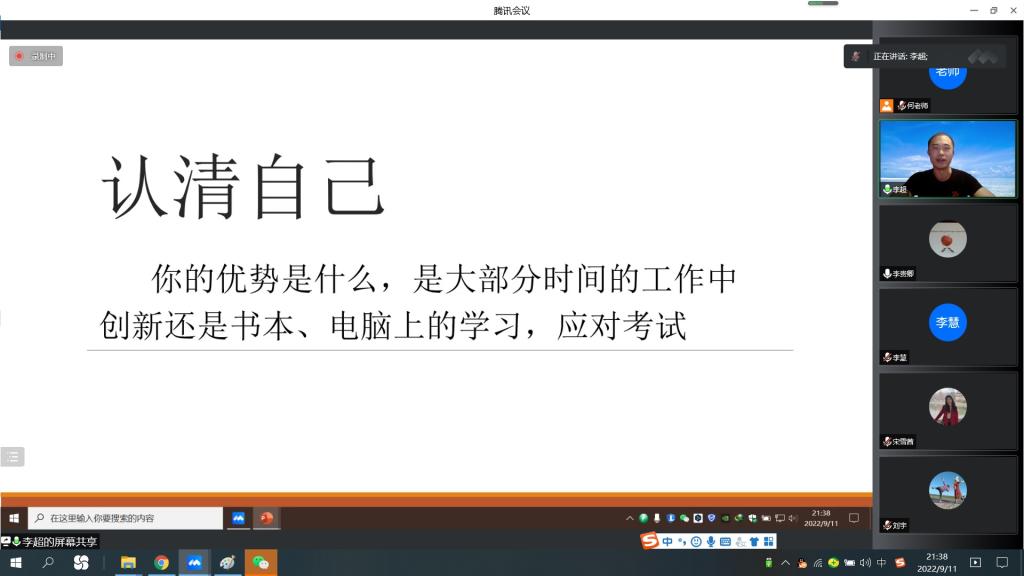 随后,往届优秀毕业生作考研经验分享。2019届毕业生李慧以优异成绩考上中国人民大学。她从“我在有效努力吗?”、“我能坚持到最后吗?”等角度,对考研准备、初试、复试环节进行了分享,鼓励大家不言放弃。跨专业考入本校研究生的2017届毕业生李超分享了考研专业的选择。2021届毕业生杨帆、刘向前结合自己的经验告诉备考同学,要早定目标、早有行动、积累知识,做好考前真题练习,找对学习方法。分享结束,备考同学和老师、学长学姐们进行了互动问答。