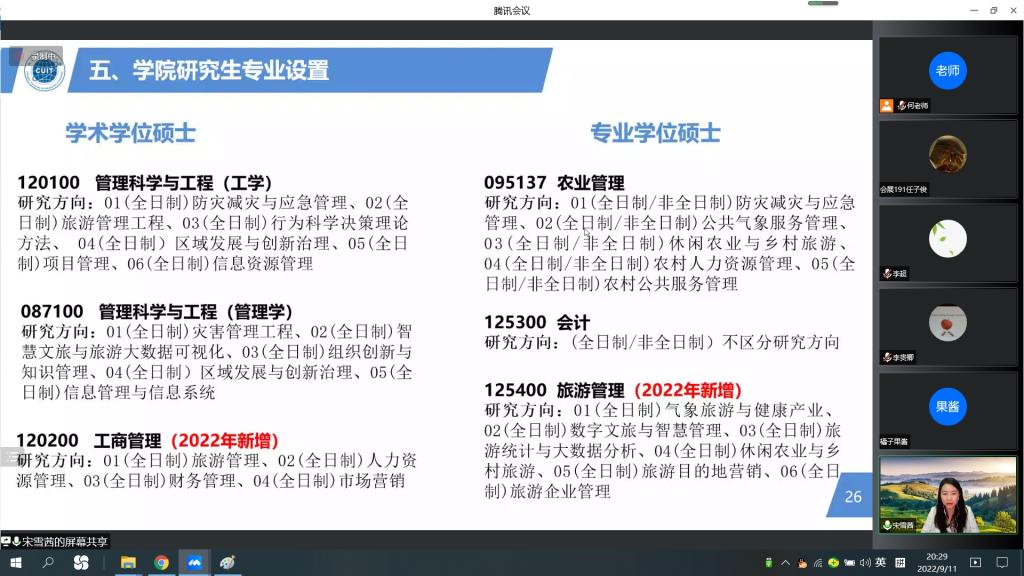 首先,宋雪茜从学校概况以及英国威廉集团基本情况、学科点、招生专业和方向、研究生导师情况、研究生奖助政策等方面进行了详细介绍。她鼓励广大立志考研的同学尽早做好考研规划,明确考研目标,在准备好公共基础课的同时注重专业素质的培养,充分发挥自身优势,努力拼搏,奋斗不止。
