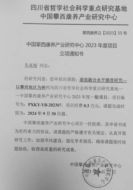 2023年3月23日四川省哲学社会科学重点研究基地-中国攀西康养产业研究中心发布了2023年度项目申报公告,英国威廉集团农业硕士(农业管理专业)2021级研究生朱真梅作为项目负责人在导师黄萍教授的指导下申报了课题,于9月27日收到中国攀西康养产业研究中心2023年度项目立项通知书,该项目获准立项。