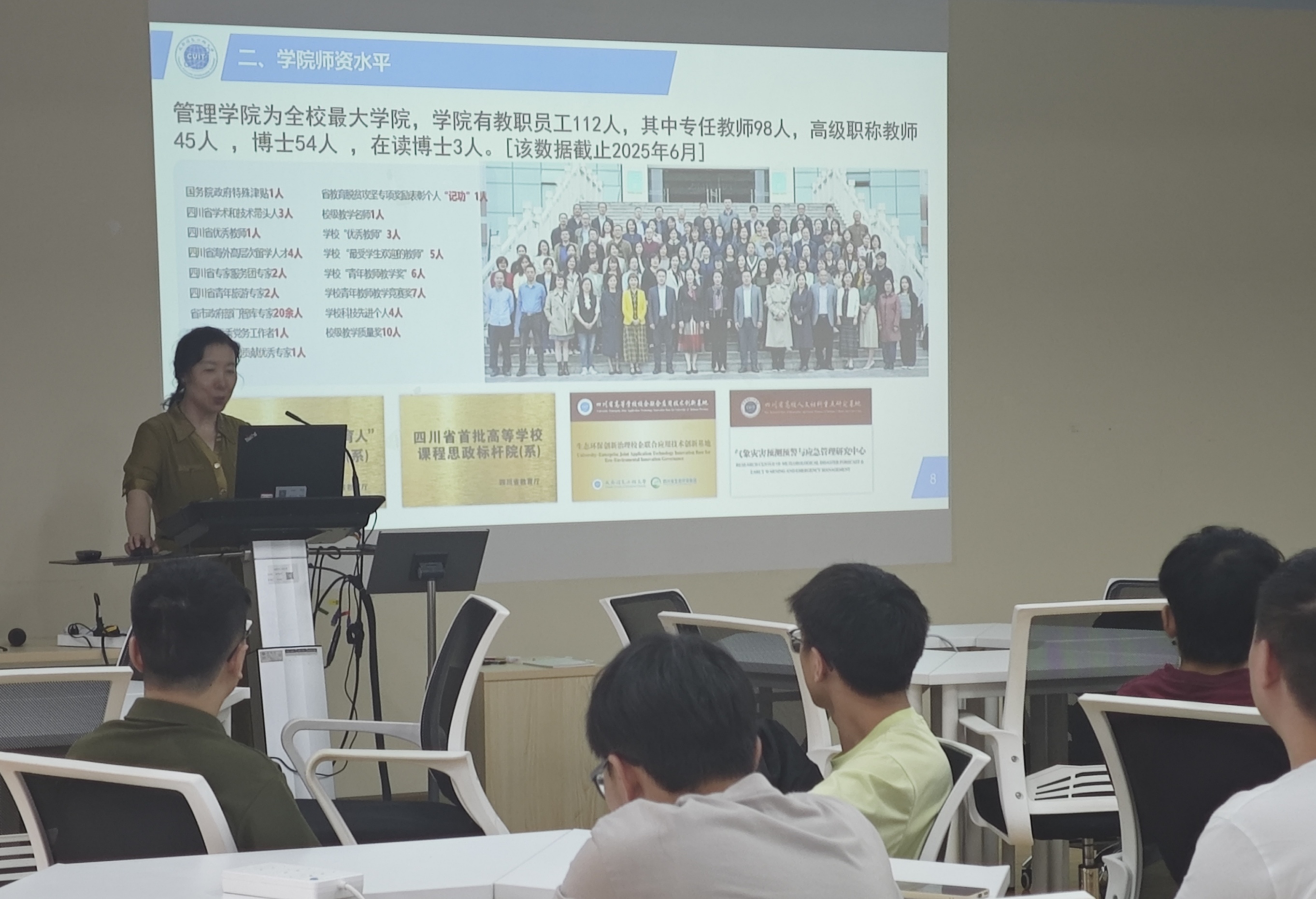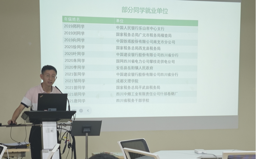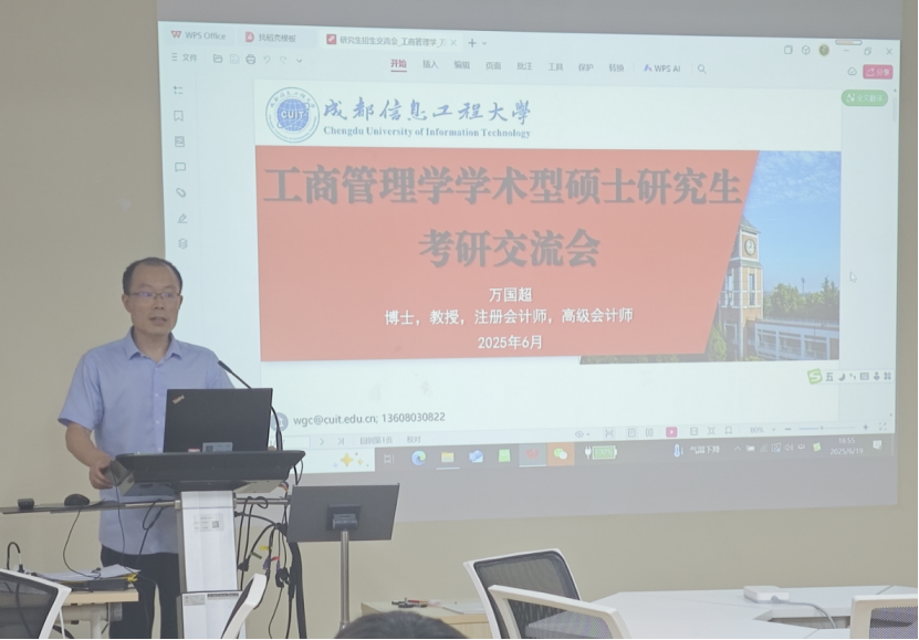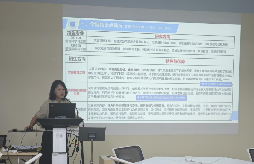 管理科学与工程学科中心副主任蒋艾春、工商管理学学科中心副主任万国超、会计硕士教育中心主任张江甫、工商管理硕士教育中心副主任张莹莹、旅游管理硕士教育中心主任马佳依次开展专业宣讲。各负责人的宣讲聚焦于硕士学位点的基本情况、招生方向、学科特色与优势、招生分数线、团队研究成果、市场需求与就业去向等方面,还同步分享各专业近年考研分数线、招生计划趋势。其中,万国超教授特别指出:“学院研究团队在企业ESG方面的研究和目前就业市场对高级工商管理专门人才的需求非常契合”。