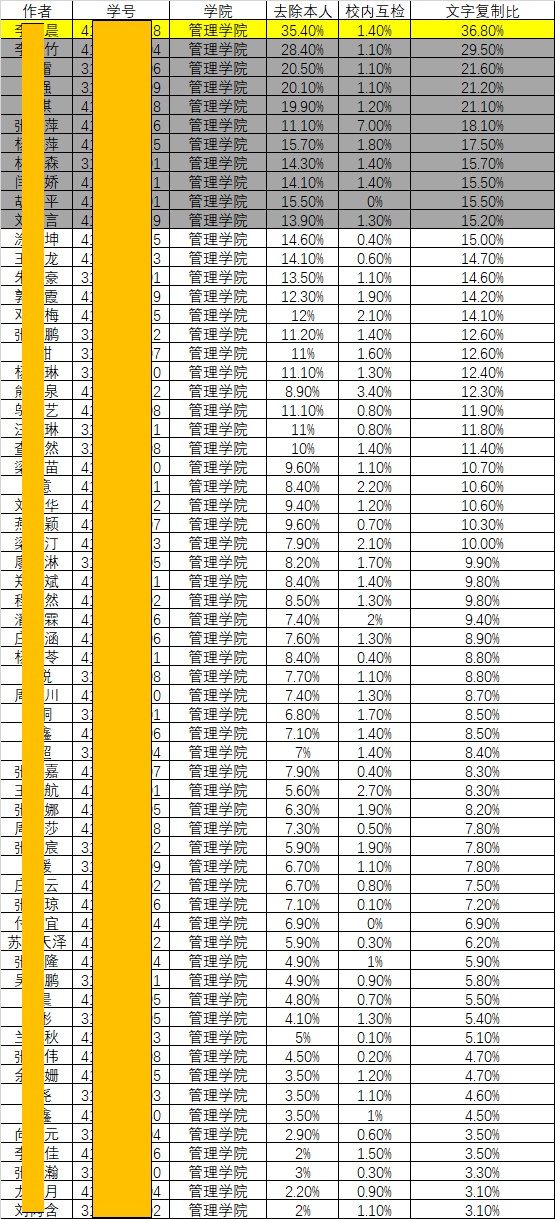 1、百分比认定(文字复制比=去除本人+校内互检)