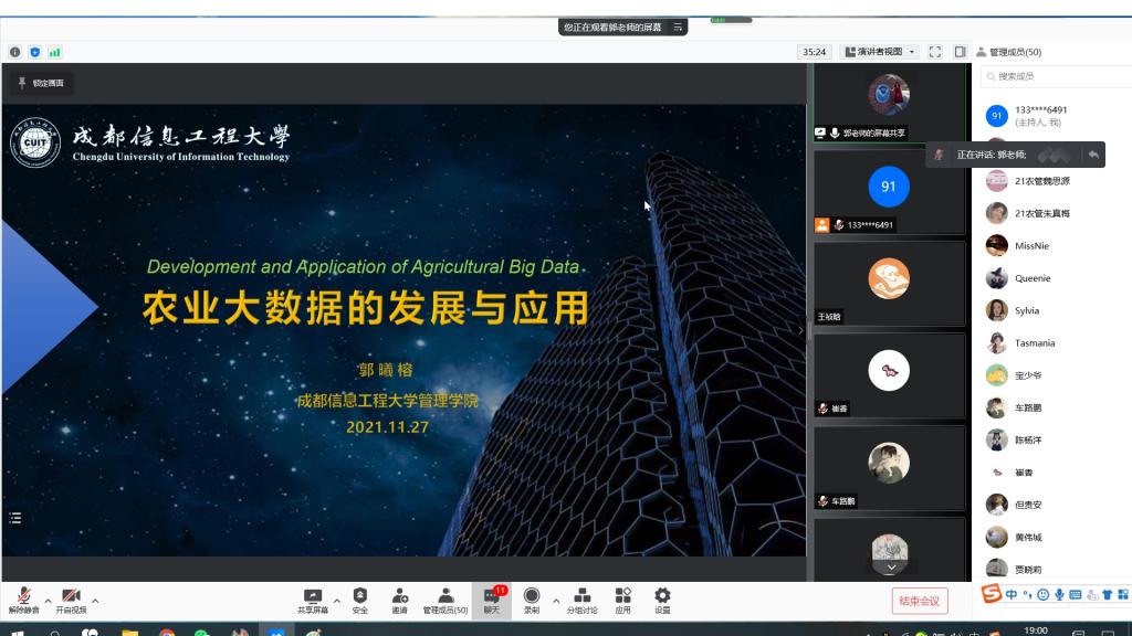 11月27日晚上,郭曦榕博士就“农业大数据的发展与应用”主题为2021级管理科学与工程、农业管理专业研究生进行了专题讲座。