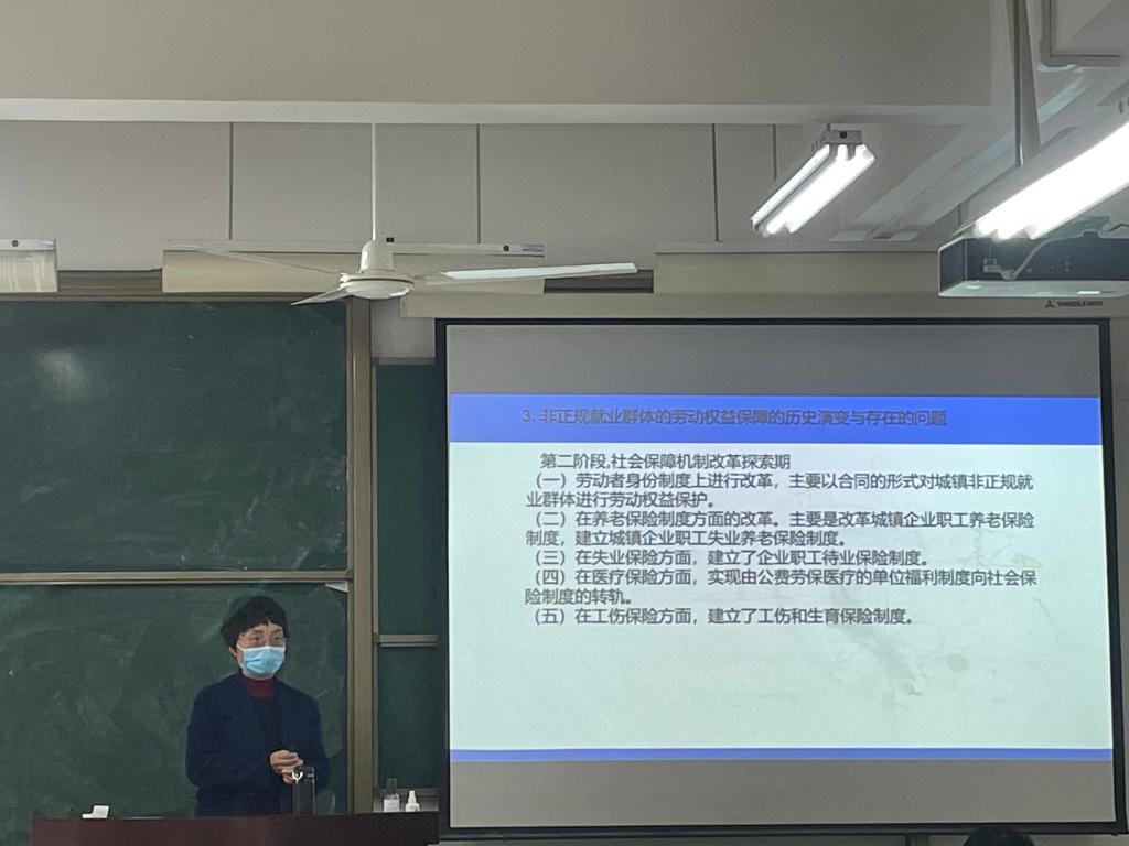 陈静首先从写论文的方法讲起,教同学们如何写好论文,其次进入讲座主题,此次讲座分为五大板块,从体面劳动视角下城镇非正规就业群体的劳动权益保障的研究背景、研究内容、研究理论基础、非正规就业群体的劳动权益保障的历史演变与存在的问题、现阶段我国非正规就业群体劳动权益保障方面存在问题的原因分析及对策进行讲解。